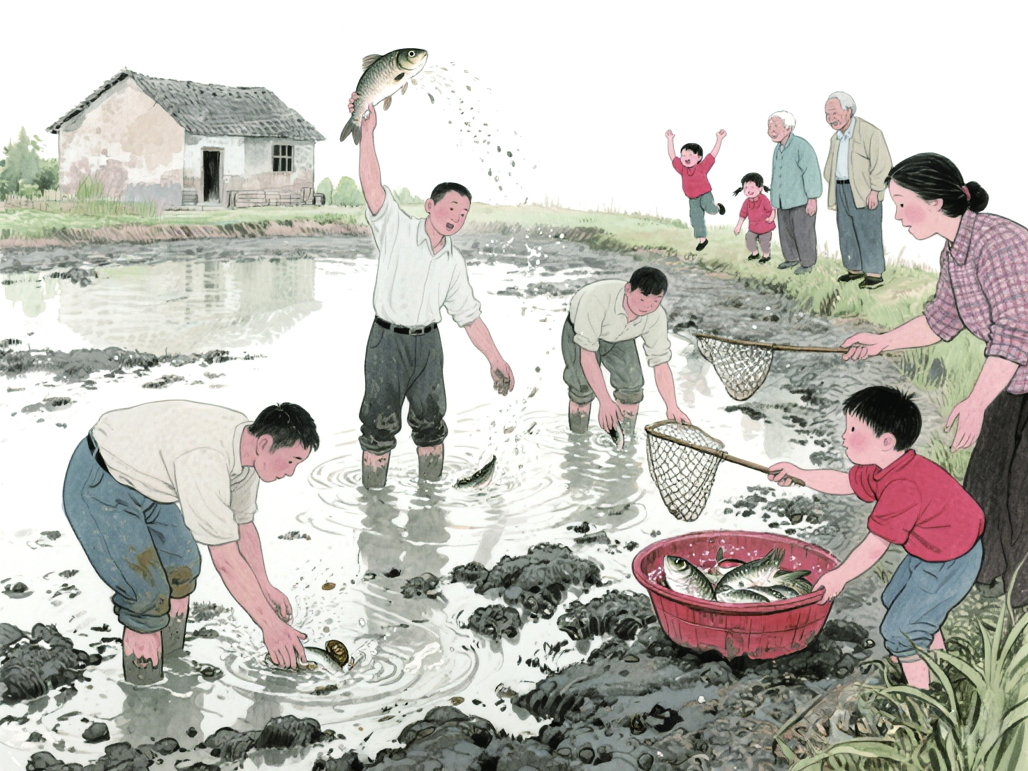 北风呼呼吹,雪花点点飘。可是鱼塘四周热气腾腾。围观的老人,手拢进袖子里,看热闹。后生侬脱下长裤,卷起衣袖,跳下池塘,双手在浑水中乱摸,很快就能摸到鱼儿,啪的一声扔到岸上,孩子们早就守在塘边,将草丛中噼啪噼啪乱跳的鱼死死按住,装进红漆木脸盆里。只要往盆中灌一点水,鱼就安静了。有的抓起鱼儿高高举起,呵呵大叫:“我爸爸立大功了,抓到大鱼啰!”叫喊声,喝彩声,此起彼伏。如果偶尔有人抓到义乌江发大水时游进塘里的鱼,有十几斤重,就人人大声喝彩。还有的不安分的小嘎,滑进塘中,和爸爸叔叔一起抓鱼。哪怕小脸蛋冻得通红,也不在乎。