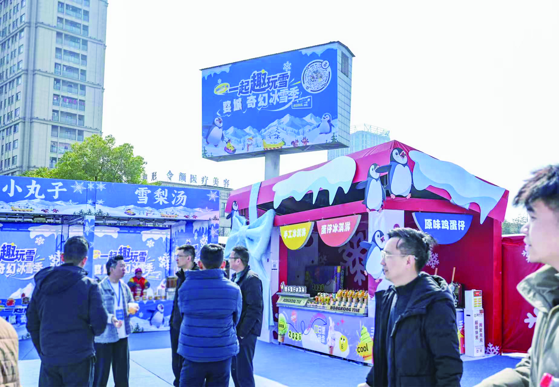 项目亮点鲜明、业态丰富。现场不仅设置专业雪滑道,还引进了4只萌宠企鹅互动打卡。此外,冰雪季还融合了多元消费体验。环绕雪场的大型花灯于当天晚上点亮,三十余个美食摊位也已全线开业,构筑起“玩雪+互动+美食+打卡”的一站式冬日消费场景,让市民在冰雪中尽享欢乐时光。小学一年级的黄子夕一早便催促妈妈带她前来:“太开心了!真的企鹅就在我面前,像从动画片里走出来一样。”