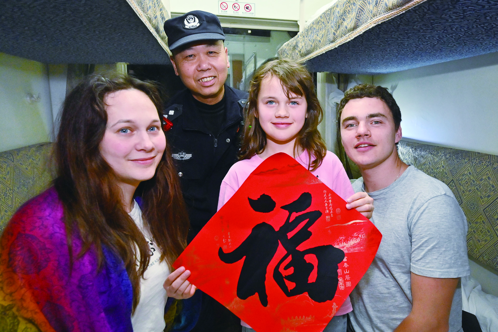 2月10日,黄庆明在T8701次列车上给旅客赠送“福”字后和他们合影。 中越国际联运旅客列车自2025年5月25日恢复开行后迎来首个春运。58岁的乘警黄庆明从2012年起就在这条线路上工作,负责T8701和T8702次列车南宁至凭祥区间的值乘任务。处置突发事件、调解治安纠纷、进行安全检查等,是黄庆明每天的工作。 即将退休的黄庆明十分珍视自己的工作:“能成为中越国际联运旅客列车的一名乘警,守护列车的安全,守护旅客的平安,是我职业生涯中很荣幸和难忘的经历。” 新华社发
