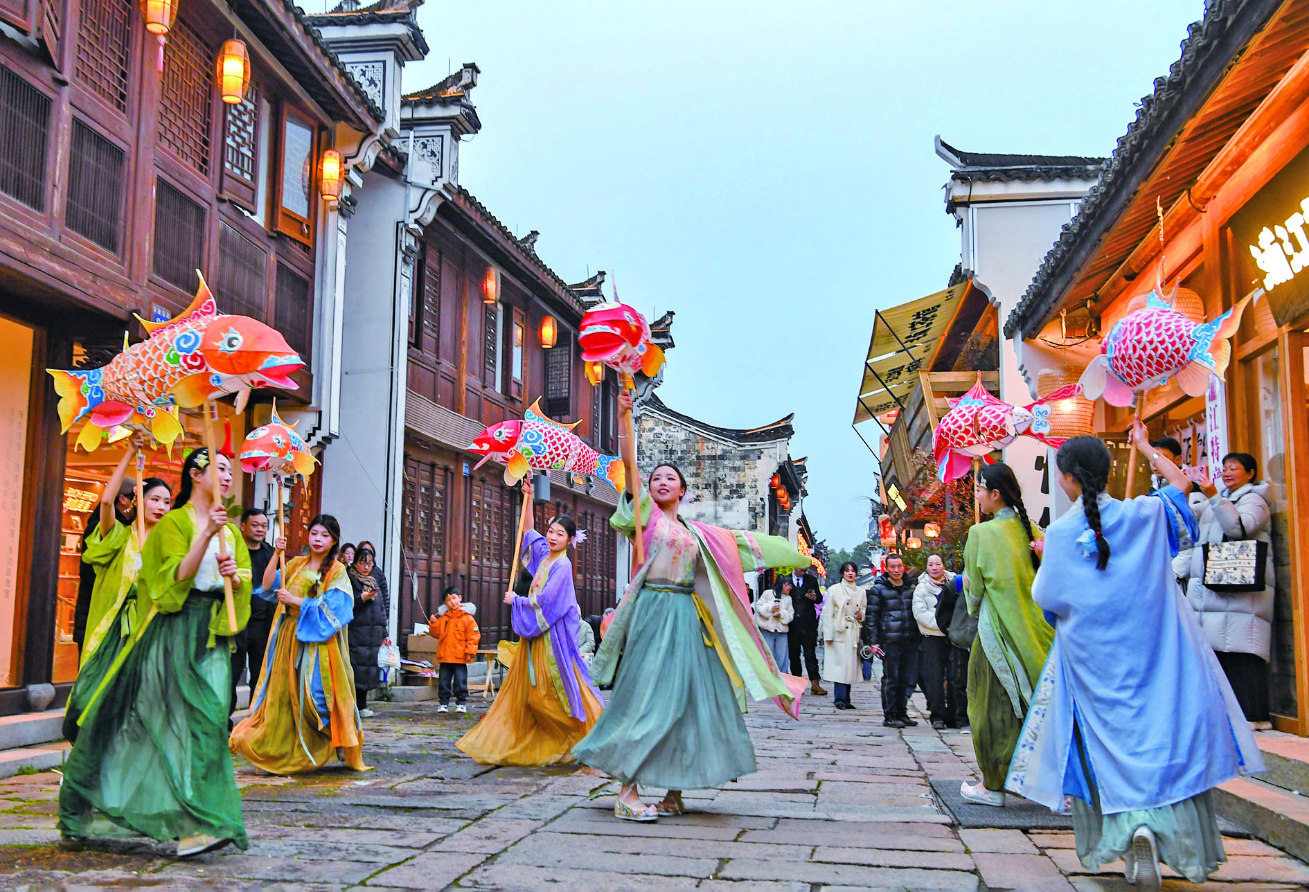 春节假期,浦江东街张灯结彩,洋溢着节日的喜庆气氛。身着汉服的姑娘们手举鱼灯走街串巷,翩翩起舞欢庆新春,吸引众多市民游客驻足观赏。