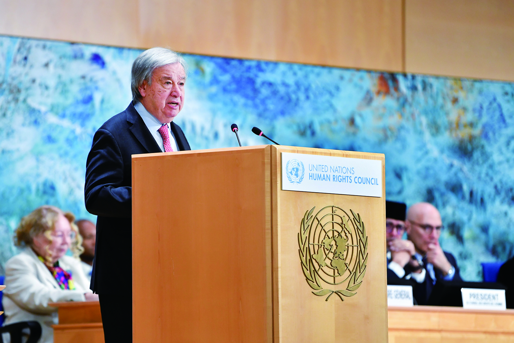 2月23日,在瑞士日内瓦万国宫,联合国秘书长古特雷斯在联合国人权理事会第61届会议上讲话。 联合国秘书长古特雷斯2月23日在联合国人权理事会第61届会议上表示,在巴以冲突中,国际法和人权正遭到公然侵犯,“两国方案”正在被侵蚀。联合国人权理事会第61届会议2月23日在瑞士日内瓦开幕,将于3月31日结束。 新华社发