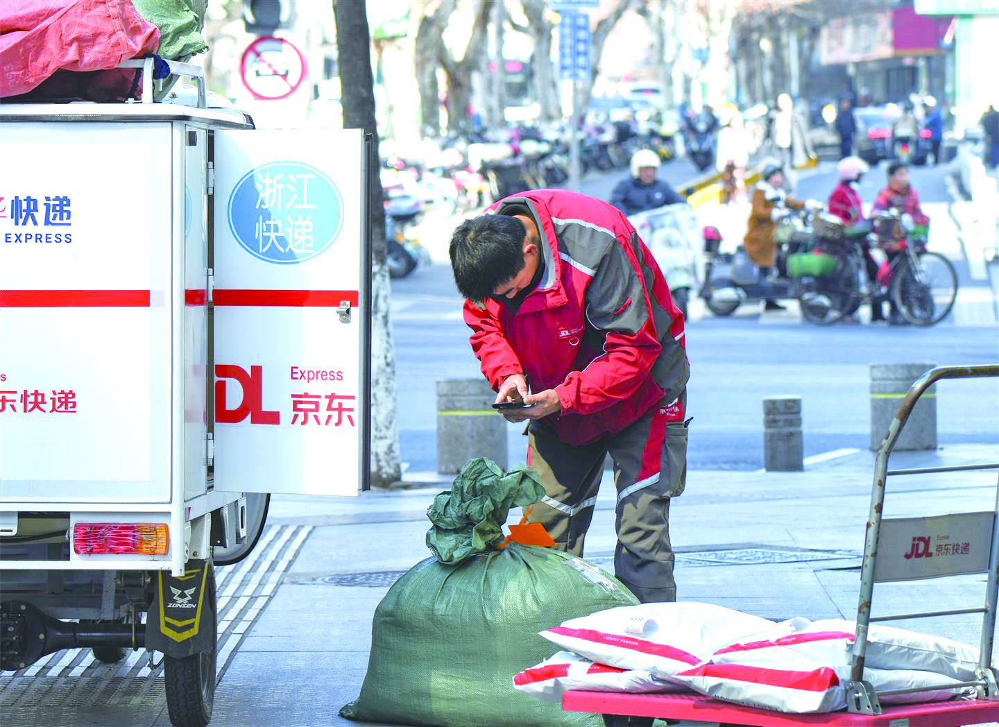 记者 李建林 文/摄 2月21日,在市区新华街上,一名快递员在投递快件。 春节期间,一些快递物流企业“春节不打烊”坚守服务,加之监管部门强化指导,多方合力保障广大居民寄递物品,确保春运期间寄递服务“不断档、不缺位”。