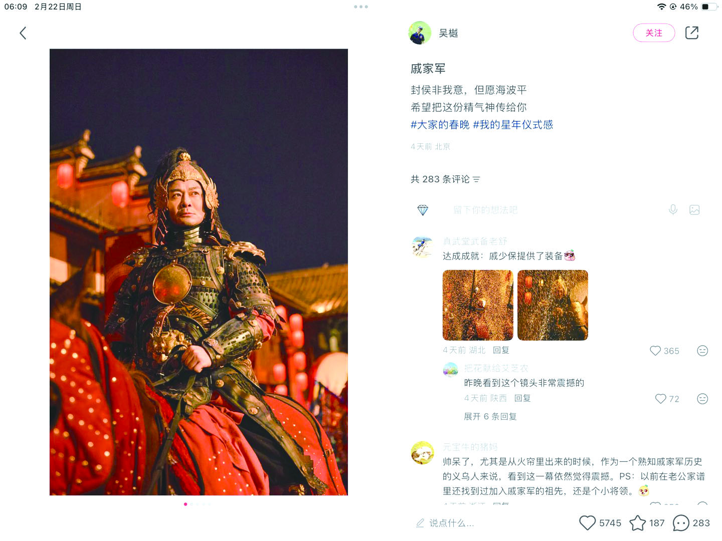 这个节目还引发了不少网友前往义乌实地感受戚家军风骨。有多名网友在评论中晒图,表示已赴西门老街打卡。网友“哎哟哇啦嘿”感慨:“今日前去,将军英雄气久久不散!” (图片来自吴樾的社交平台)