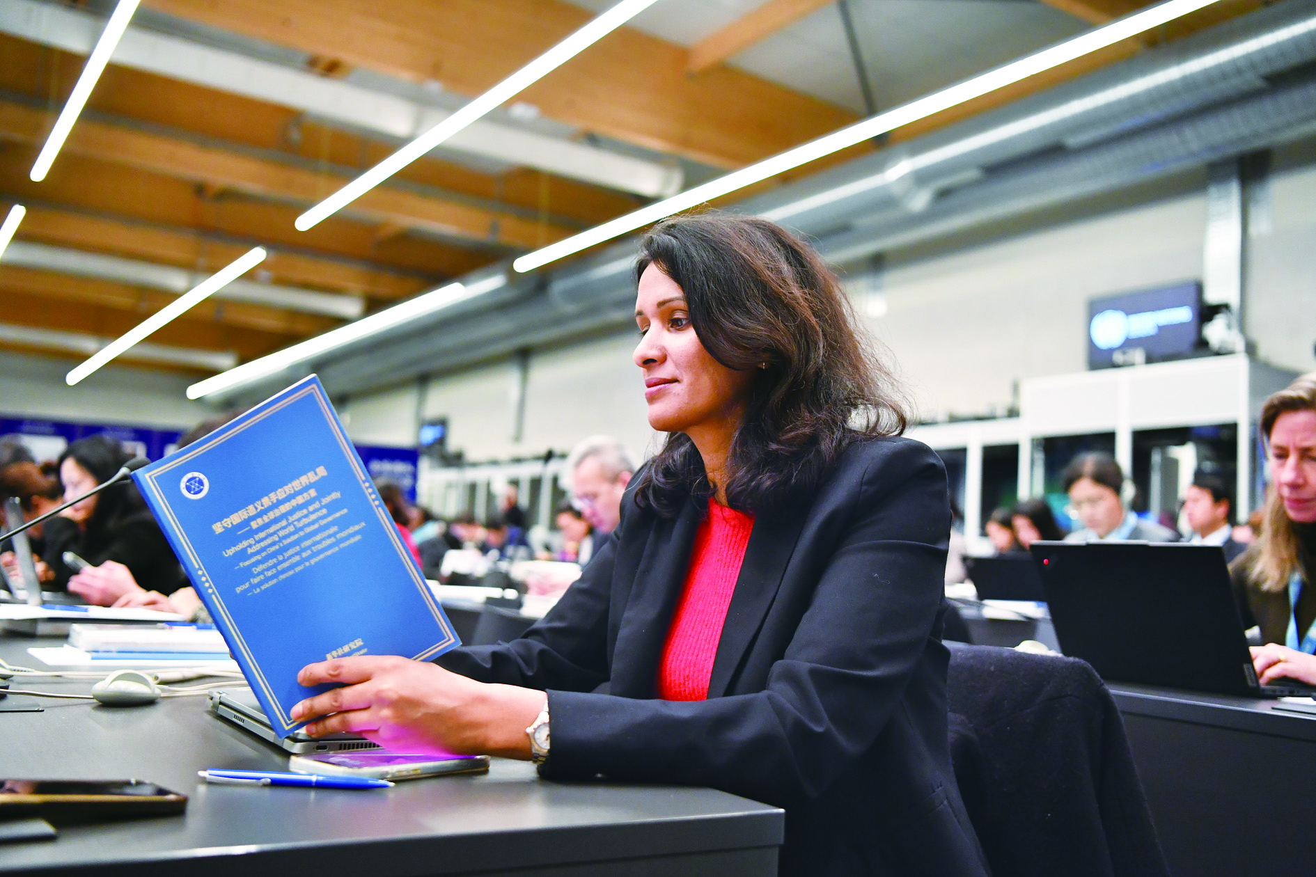 2月24日,在瑞士日内瓦万国宫,嘉宾阅读《坚守国际道义携手应对世界乱局——聚焦全球治理的中国方案》智库报告。 新华社发