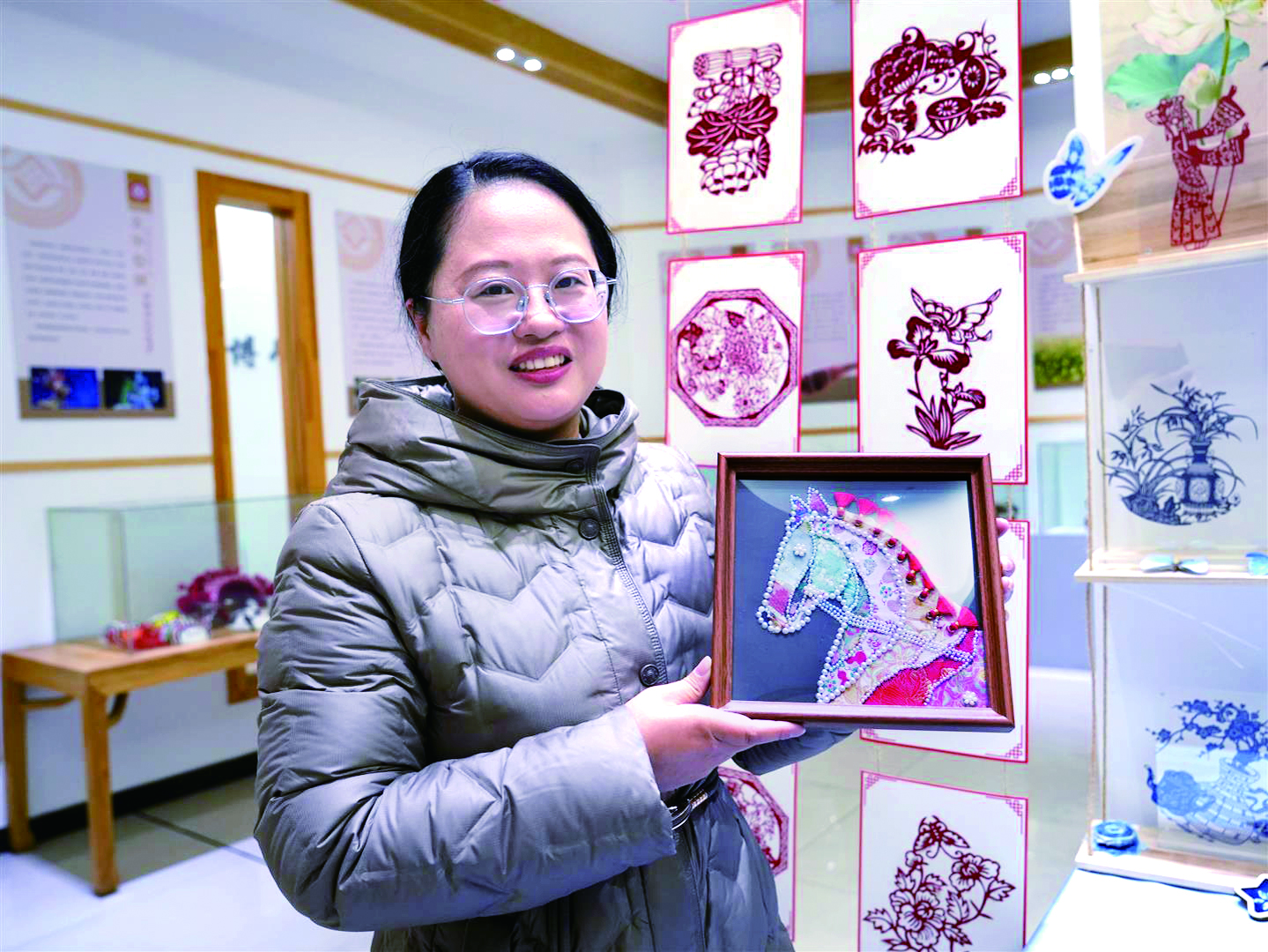 在金华开发区三江街道文化站的展示厅里,陈列着不少带有非遗元素的手工作品,其中一个承载着马年祥瑞的宋锦画框,将千年非遗宋锦与马年生肖元素巧妙融合,在这个新春佳节显得格外引人注目。