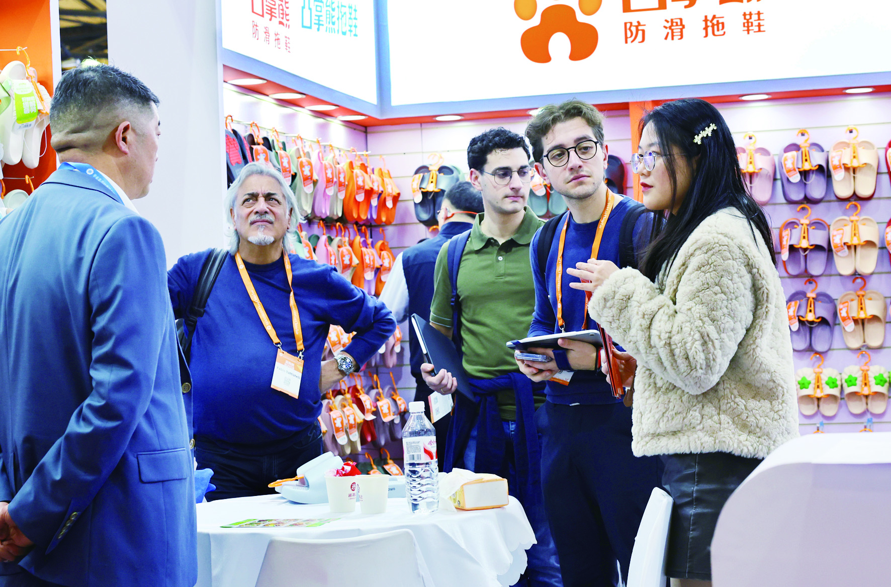 3月1日,展商工作人员(右一)向采购商介绍产品信息。 3月1日,第34届华东进出口商品交易会在上海新国际博览中心开幕。本届华交会展览总面积达11.5万平方米,3300多家国内外企业参展。 新华社发