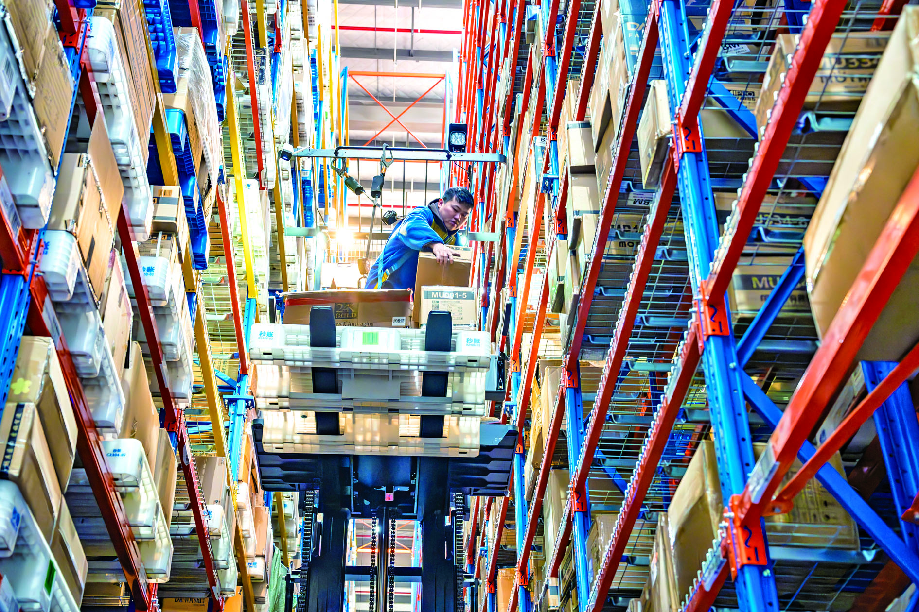 3月2日,在浦江秒账智慧物流产业园内,工作人员正在使用高位叉车分拣商品。