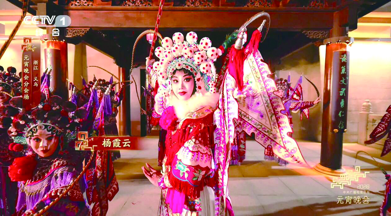 3月3日晚,中央广播电视总台2026年元宵晚会精彩上演,浙江义乌分会场以商贸活力与民俗风情惊艳全国。浙江婺剧艺术研究院(浙江婺剧团,简称浙婺)和义乌市婺剧保护传承中心(简称义婺)的20多名婺剧演员携婺剧经典选段《穆桂英·大破天门阵》精彩亮相,为节目《开市大吉》添彩。