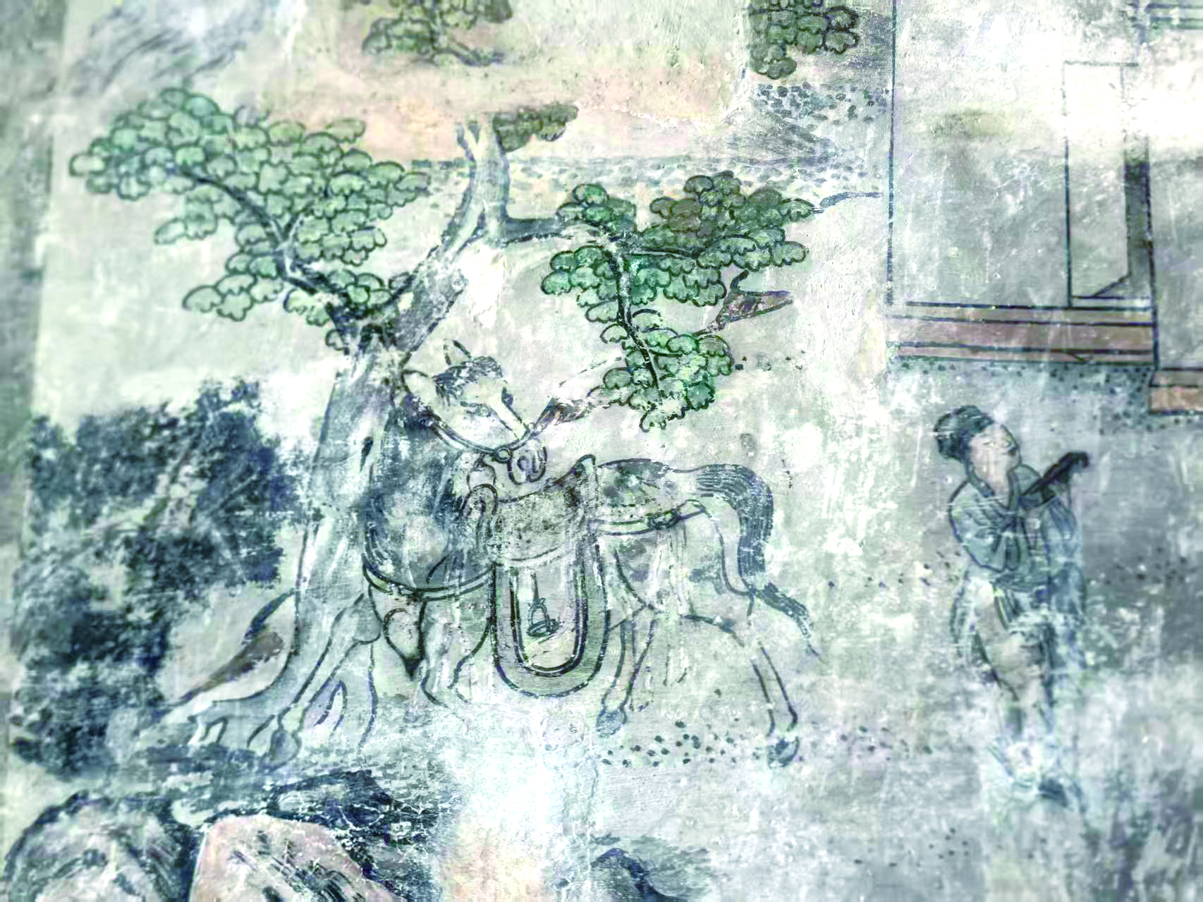 由室外转向厅堂,在木雕与壁画上也能觅得骏马的身影。侍王府壁画数量尤为可观,现存壁画94幅,堪称全国太平天国建筑群之最,而这些壁画大多保留在西院。西院共有四进,一进、二进门厅是壁画主要绘制区域,墙壁、门板、天花板以及走廊上有大量的壁画、彩绘以及石、木、砖雕等。一进西厢房东壁第二壁《教子送书图》中,除了三个人物形象外,院子里还有一匹马。它静立树下,鬃毛柔顺,与壁画中母亲“教子送书”的温情场景相映成趣。