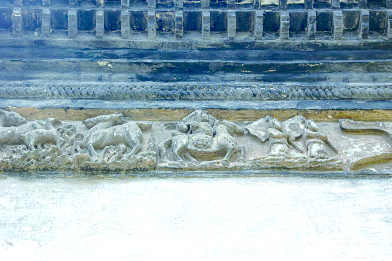 穿过保宁门,沿鼓楼里的小路蜿蜒而上,侍王府门前的照壁巍然矗立眼前,它高7.6米、宽17.2米,是国内现存唯一的太平天国照壁。檐下雕有《军士出行图》,砖石之上,将士们披甲持械,列队前行,生动再现了当年金戈铁马的征战场景。西院门厅外墙的石雕上,一匹小马憨态可掬,头扭向身后,仿佛在张望什么,与照壁上奔腾的战马形成反差。