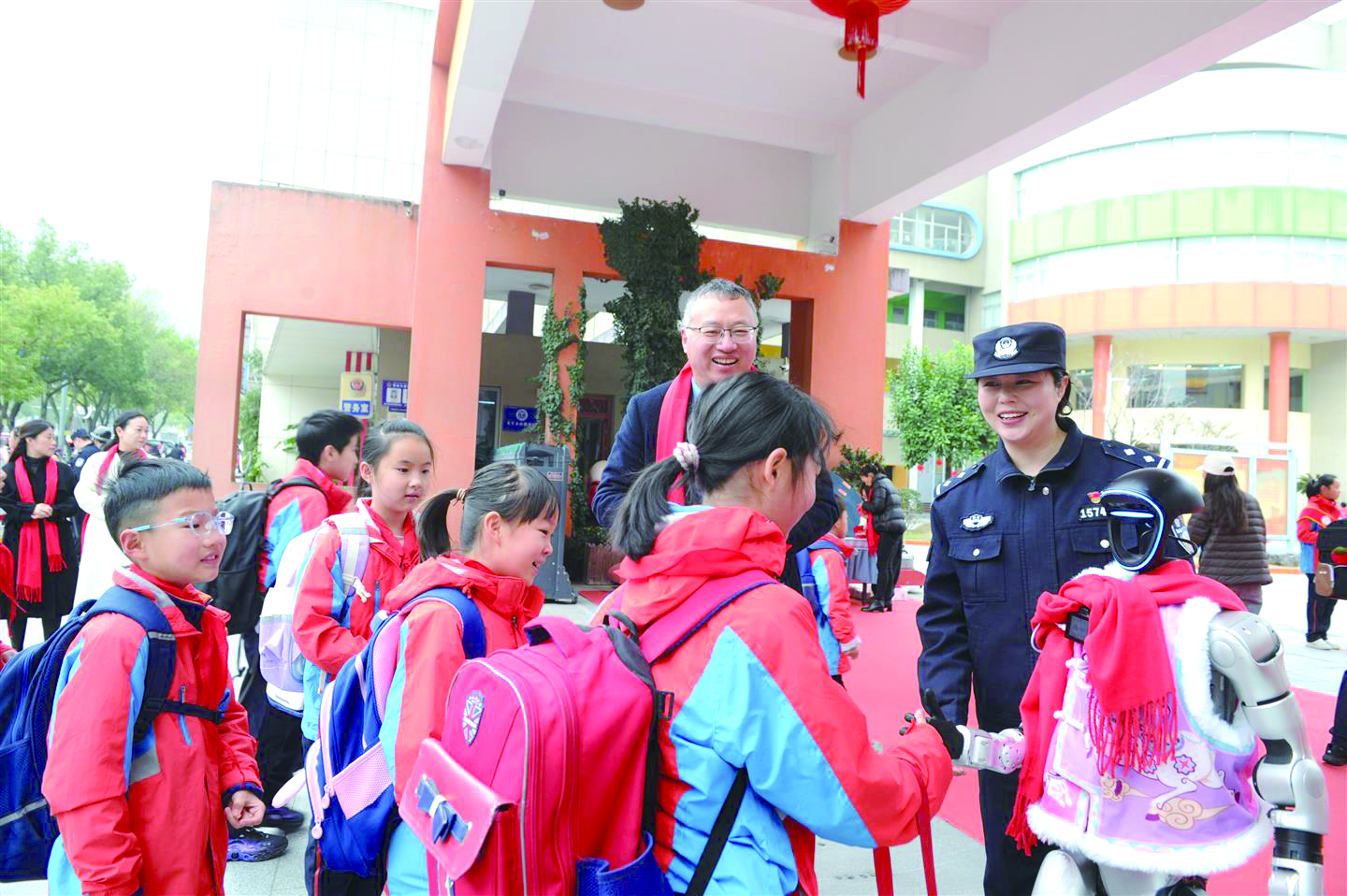 记者 董超毅 通讯员 蔡伟华 文/摄 3月4日,在东阳市吴宁第五小学校门口,东阳市公安局吴宁派出所民警与一个“类脑具身智能机器人”同时开展护学执勤。 据了解,该机器人由东阳市保安服务有限公司与浙江大学联合研发,具有巡逻、语言互动、门岗登记等功能。
