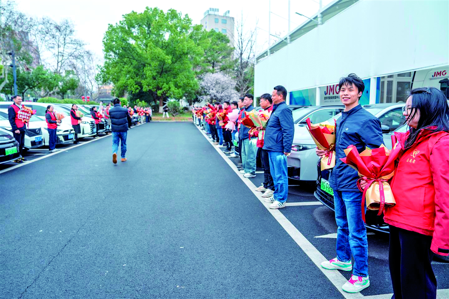 当日,由金华市新闻传媒中心记者、志愿者、青年学生志愿者代表,及由金华市通祺汽车销售有限公司、零跑汽车金华直营店组建的送花车队,将一束束鲜花送到身边的“雷锋”手中。