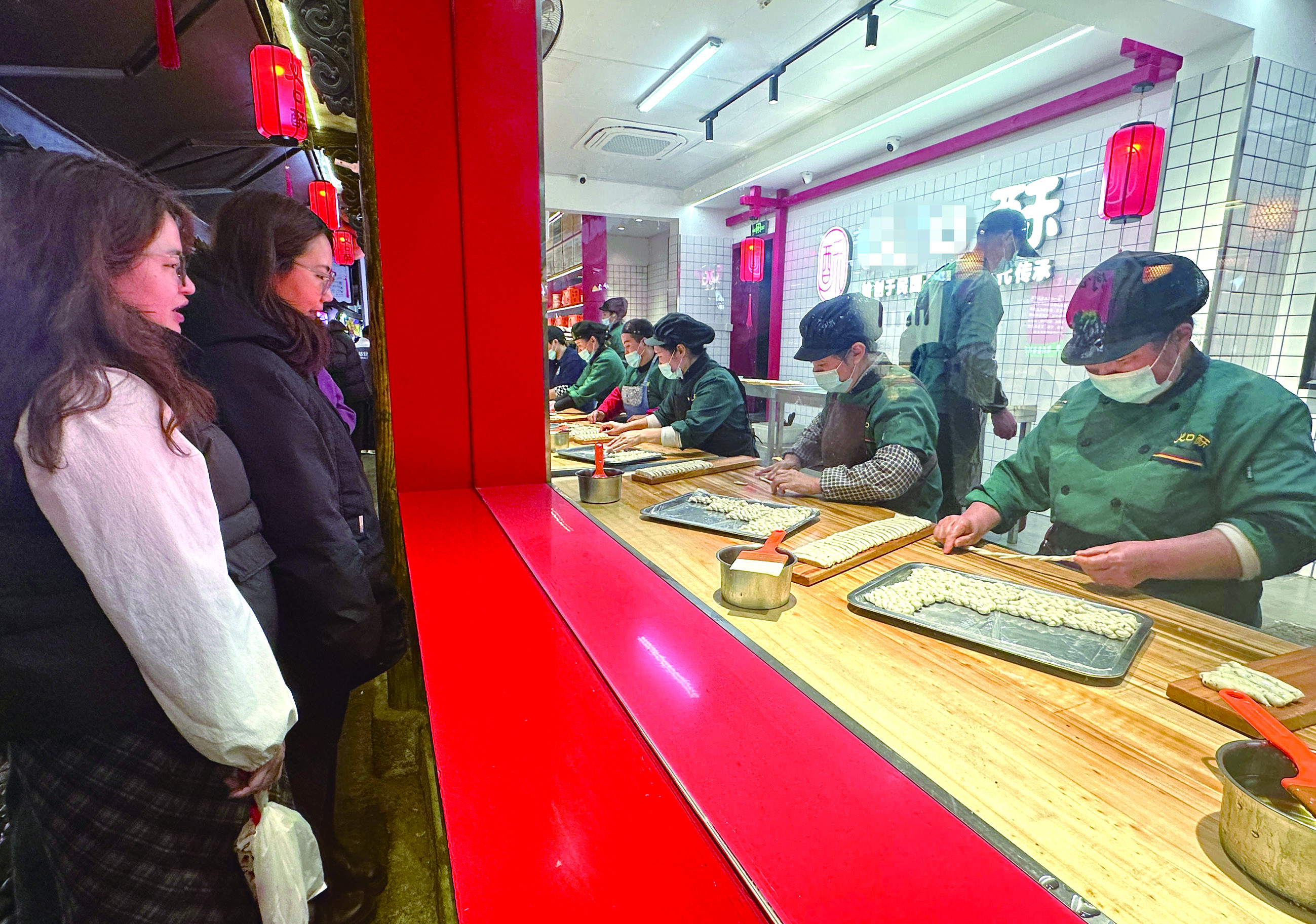记者 钱旭升 文/摄 3月10日晚,在义乌佛堂老街上,一家麻花店凭借“明厨亮灶”的经营方式,成为游客与市民的“打卡点”。店铺通过全透明玻璃橱窗,将麻花揉制、成型等制作过程展现在顾客眼前,让消费者直观感受到食品制作的卫生与规范。不少游客和市民驻足观看后,纷纷下单购买。