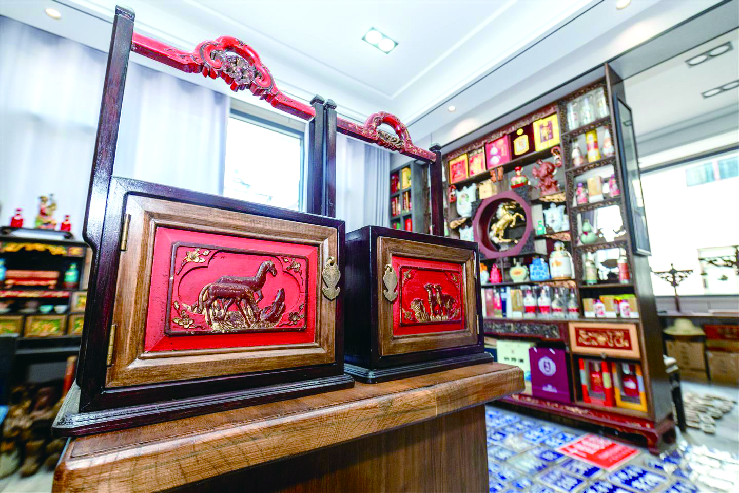 高国俊收得最多的是传统木床、柜子、提篮上的花板。这些花板大多有破损,经过他的再加工,却成了工艺品。他家里的柜子、挂画、茶桌甚至是台灯,都巧妙地用上了花板,老物件装饰现代家居,别有一番意趣。