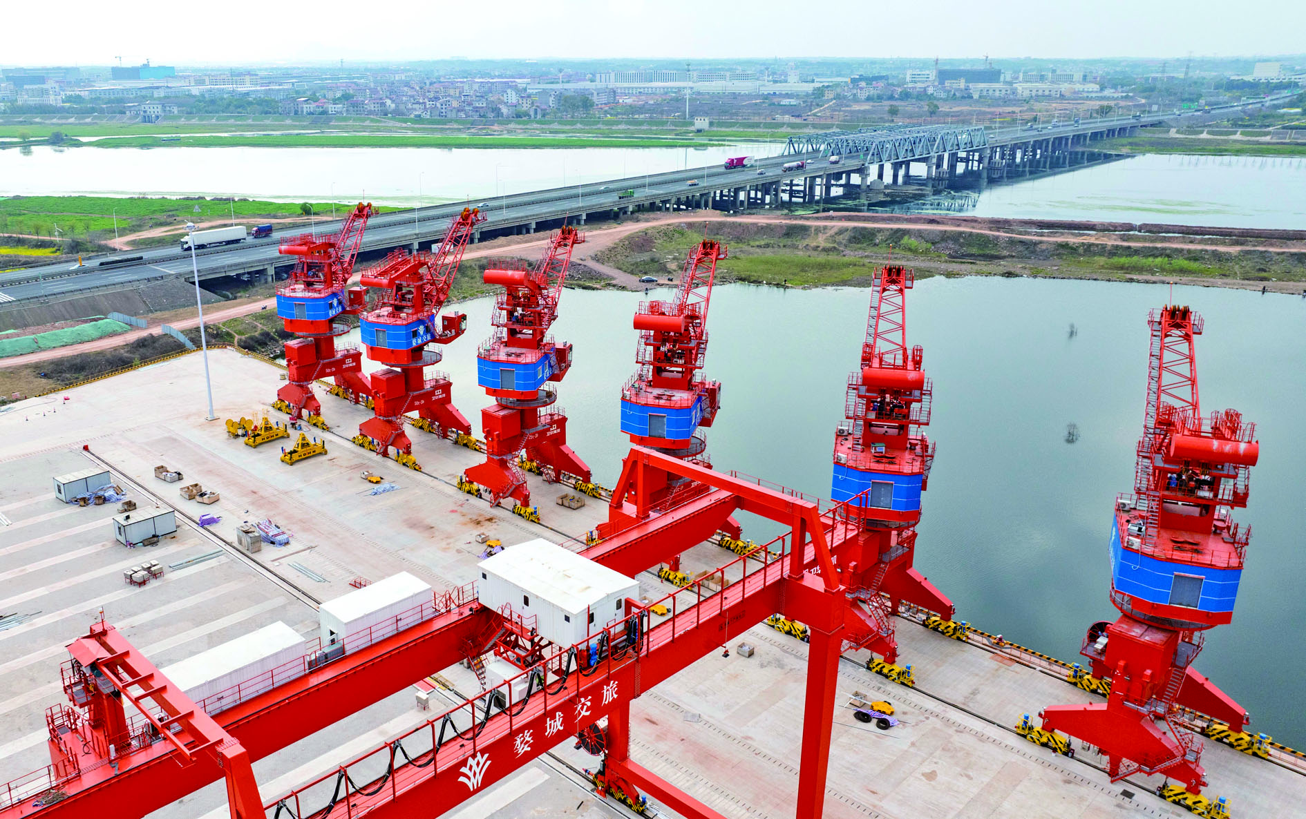 作为金华江首个投入建设的大型综合内河港区,目前项目一期工程总体形象进度已达92%,一个现代化的内河港口雏形清晰可见。现场负责人介绍,土建、房建及设备安装均已进入最后冲刺阶段,两台龙门吊已安装到位,卸船机、装船机等主力设备也陆续就位。按照当前攻坚进度,项目一期工程计划于6月底全面建成。