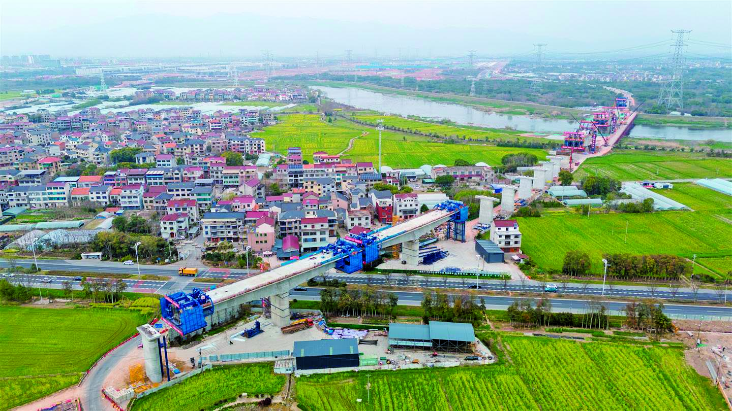 3月16日,在金华铁路枢纽扩容改造工程东阳江特大桥施工现场,工程正在有序推进中。