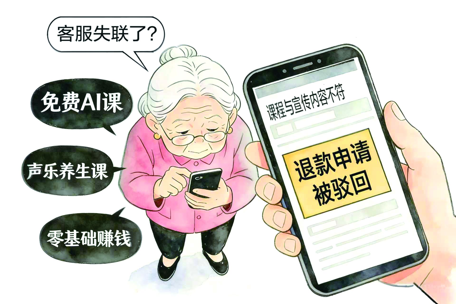 心动的刘爷爷很快支付了几千元学费。然而,学了一个月,他发现课程内容艰深、根本跟不上。当他提出退费时,对方百般推托,转而推销“更易理解”的进阶课程,并承诺提供一对一辅导。刘爷爷又交了千元学费,结果依旧收效甚微。再联系对方时,已被拉黑。
