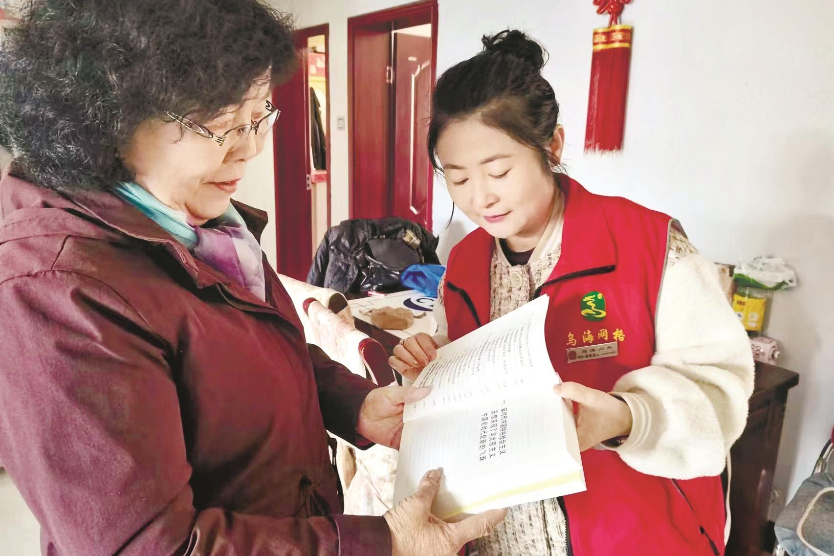 近日,海勃湾区林荫街道海馨社区党委“送学上门”小分队积极开展“送学上门”,打造社区“行走”的党员学习课堂,力求做到主题教育对象全覆盖、不脱节、一个不落。 (段维娜 摄)