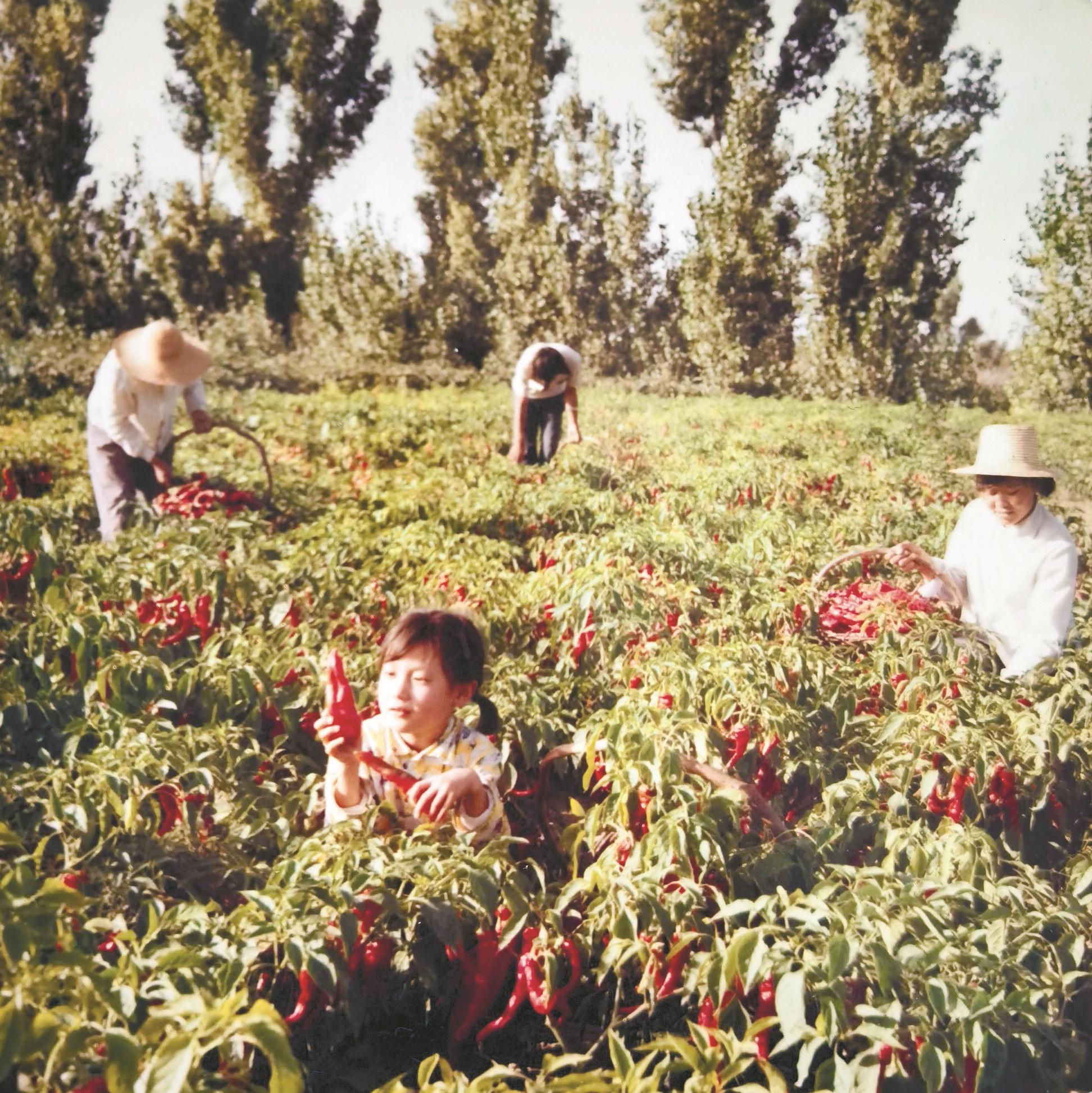 照片拍摄于1980年8月,为杨星灿到包钢卡布其石灰石矿农场采访时带着小女儿(前)在辣椒地里看采摘辣椒时的情景。