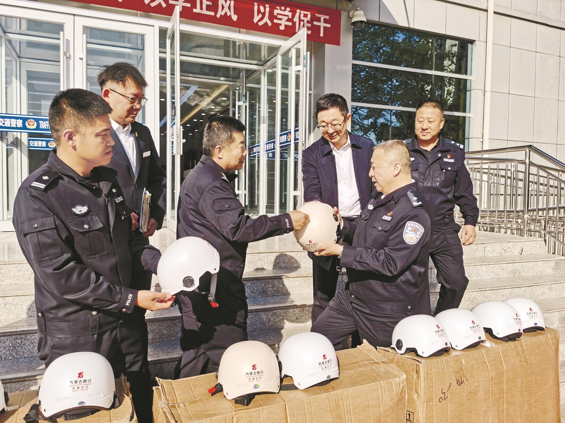 近日,内蒙古银行安居支行向海勃湾交管大队赠送1000个安全头盔,助力海勃湾交管大队专项整治电动车驾乘人员未规范佩戴安全头盔及不文明驾驶行为,携手共创平安、有序、文明、畅通的道路交通环境。 (陈洋 摄)