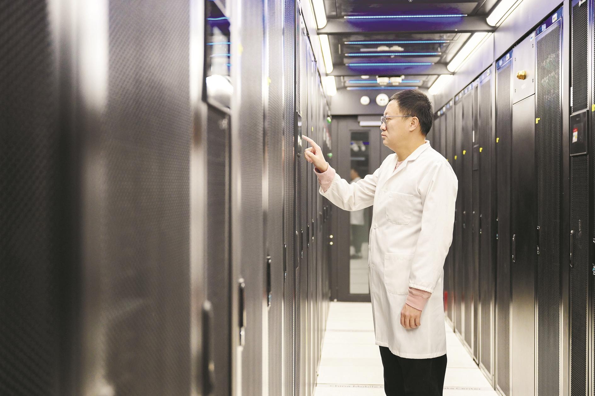 11月28日,工作人员在位于呼和浩特市和林格尔新区的中国移动呼和浩特数据中心对设备进行巡检。