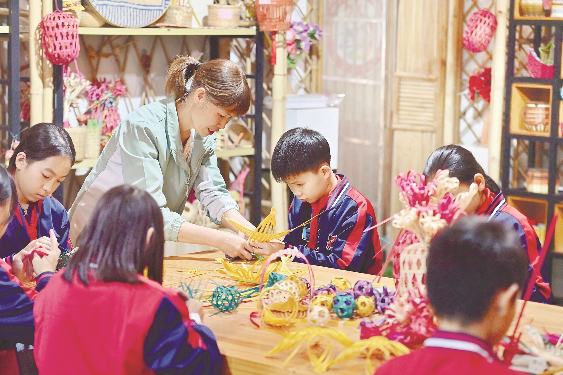 11月28日,在广西岑溪市南渡中心小学,老师在指导小学生练习竹芒编织技艺。近年来,广西岑溪市南渡中心小学将当地非遗项目——竹芒编织技艺引进课堂,打造特色校园文化,丰富学生课外生活。