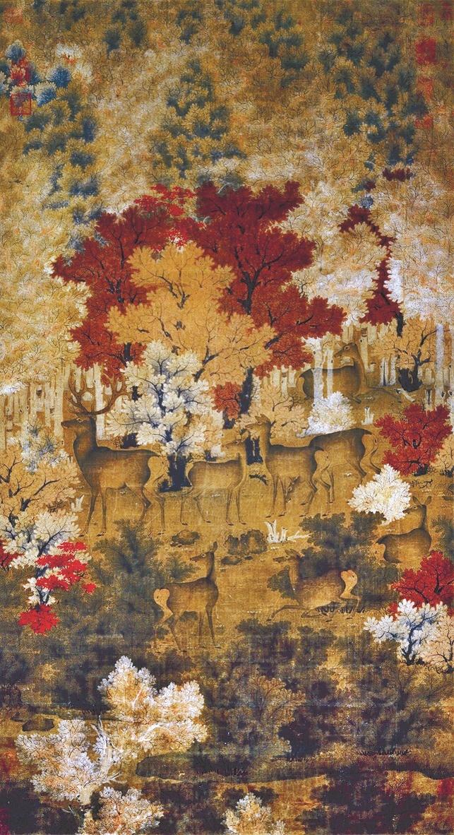《丹枫呦鹿图》轴是一件令人耳目一新的古画精品。这件作品纵118.5 厘米、横64.6厘米,无作者名款,绢本设色,画面捕捉了色彩斑斓的树丛中鹿群动静相宜的生动场景。图中钤印元内府“奎章”“天历”二长方朱文半印,印证该画在14世纪前半叶曾入藏元代内府。旧题于五代,图内押有乾隆、嘉庆皇帝诸玺,裱边印有清初收藏家阿尔喜普等人的藏印,后为清宫藏品,入编《石渠宝笈初编》《故宫书画录》卷五等著录,现藏于台北故宫博物院。
