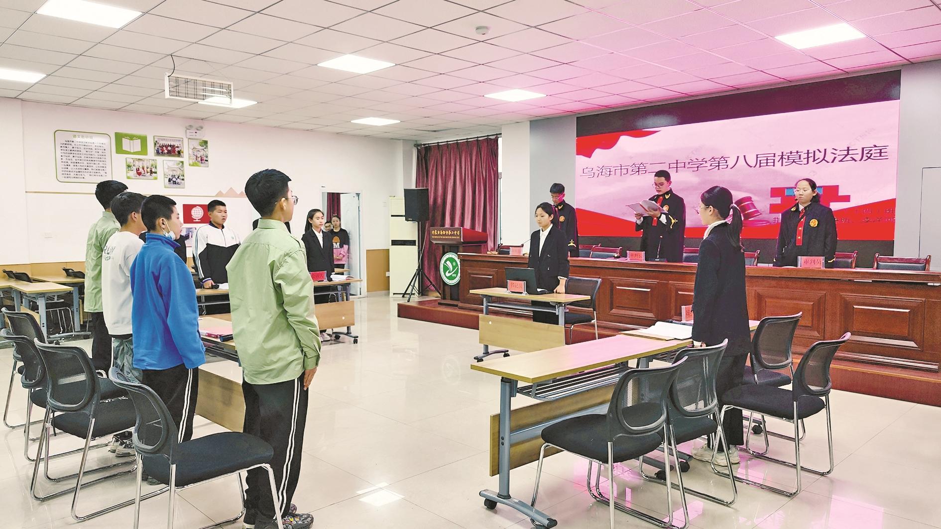 近日,市第二中学组织学生开展了校园模拟法庭活动,通过情景演绎、案例模拟、庄严审判,让学生直观地了解案件审理流程。“沉浸式”的庭审体验既强化了法治宣传的互动性、趣味性,也更有利于学生进一步树立宪法意识,自觉养成学法、知法、守法、用法、护法的良好习惯。(赵政宇 摄)