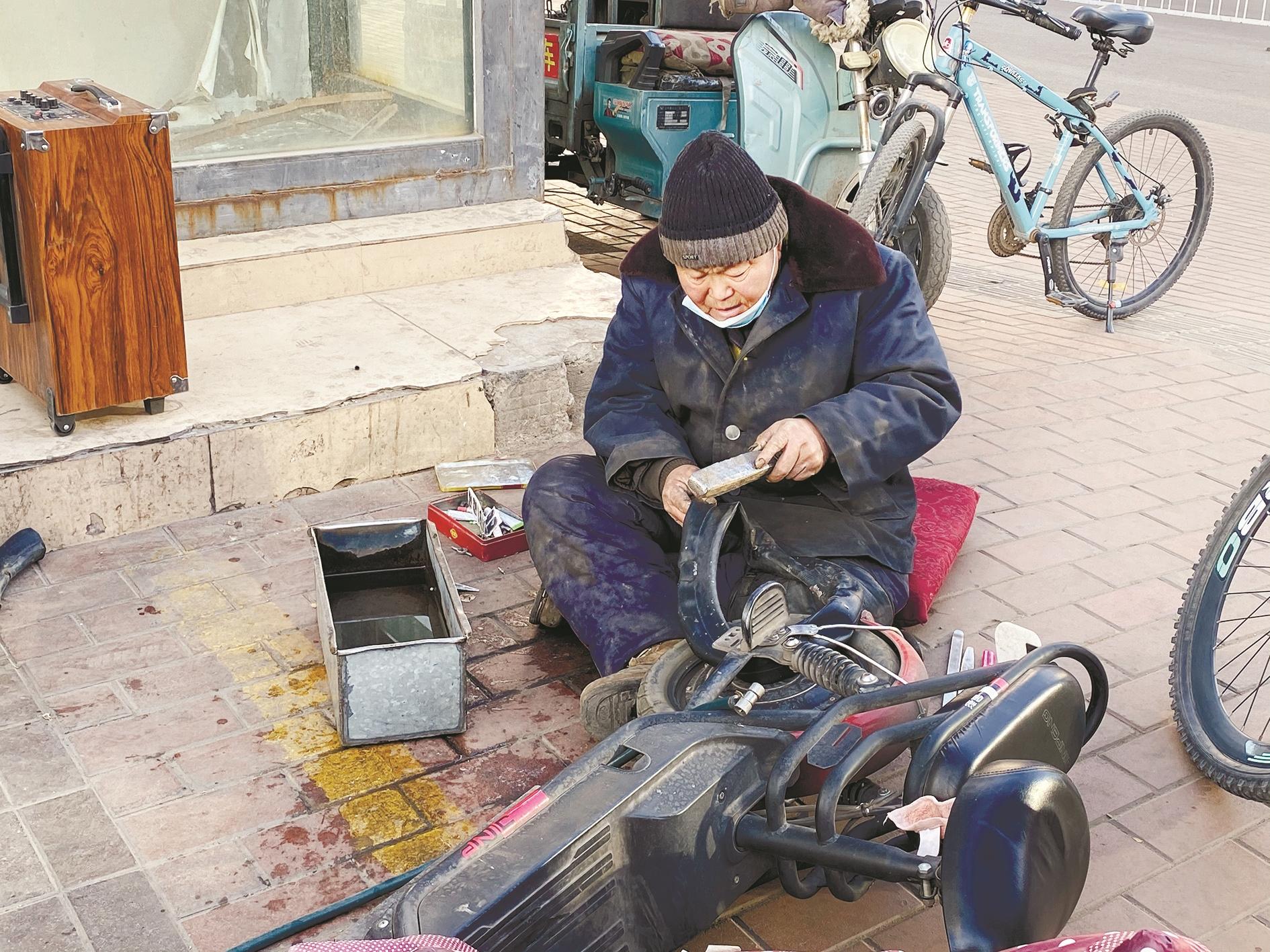 下午3时,修车师傅在桌子山街边给电动自行车补胎。