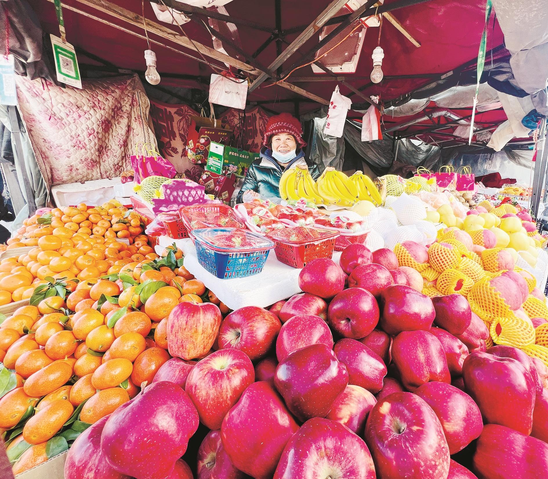 ?上午十一时,依林市场里的商户吆喝着售卖新鲜水果。