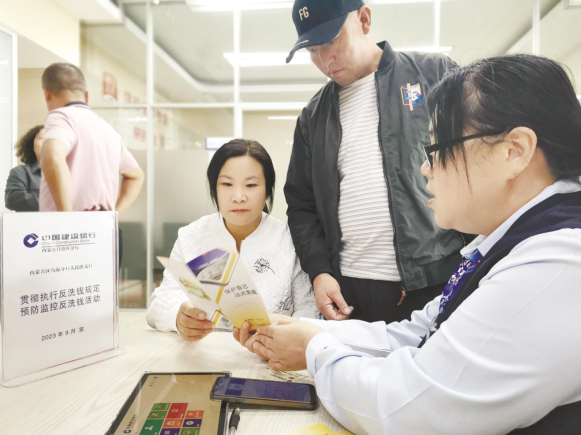 近日,建行乌海分行工作人员立足厅堂开展反洗钱宣传活动,让市民学习更多金融知识,增强市民风险防范意识。 (陈洋 摄)