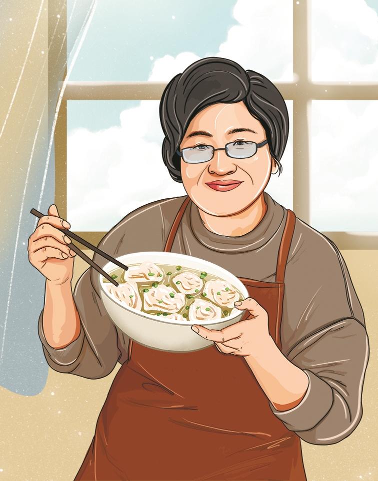 母亲用芹菜、胡萝卜、香菇、豆腐调成馅儿包了馄饨,又熬了一锅紫菜蛋花汤,端到胖婶家。啥时候胖婶想吃了,母亲再用她家炉子帮她煮馄饨。馄饨需围着炉子,趁热乎喝上一碗,味蕾才舒坦。晚上,母亲回来后,终于松了口气,说胖婶喝了一碗馄饨,总算能正常吃饭了。
