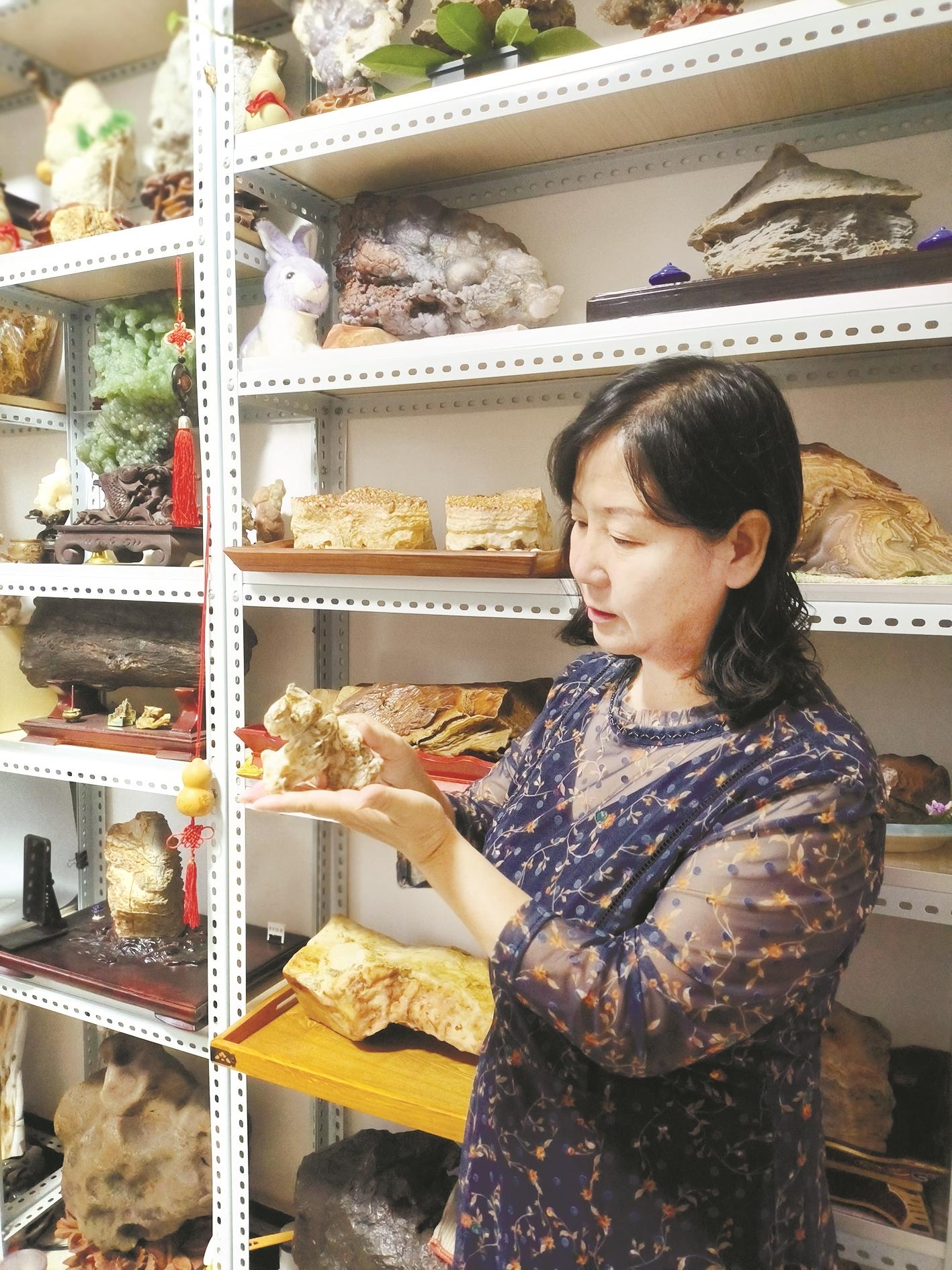 李建平,出生于1969年,她从2002年开始接触戈壁石,感叹大自然的神奇,自然形成的造型、纹理、色彩等。“为了更加了解懂得石头,我开始深入学习,了解它的形成原因、质地结构。给喜欢的石头起名还要翻阅古诗词、文学典故等,自从喜欢上石头后也开始爱学习了,上学的时候也没这么认真过。”李建平笑着说。