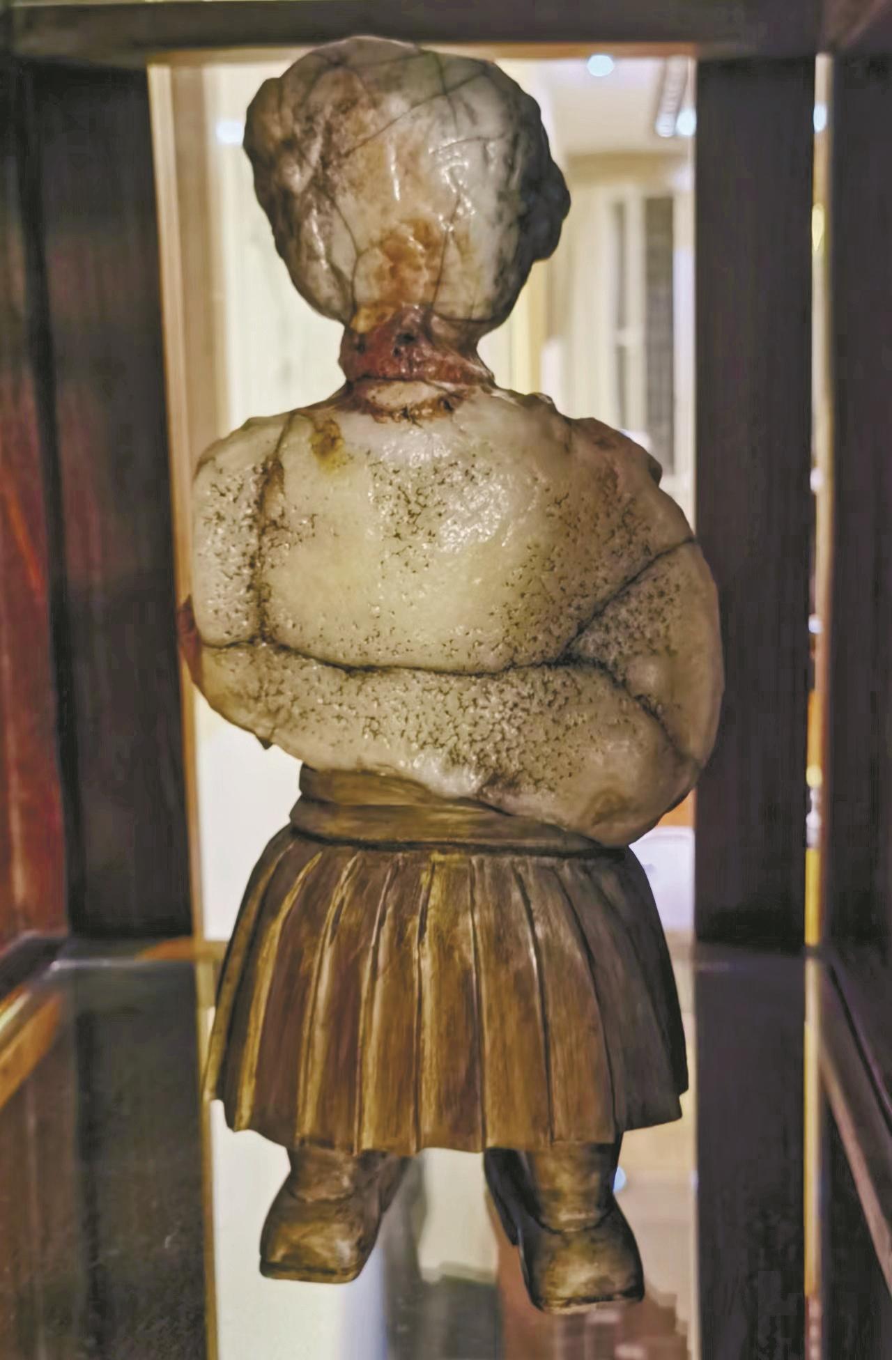 一方美石,配一个合适的底座,效果立刻就显现出来了。比如此石,让你不得不佩服藏者独特的眼光与想象力。在常人眼中的一块普通之石,而且还是一块残石,经其巧妙构思和一番艺术整理,便出落成一位栩栩如生的“戈壁少女”。之所以称其为“戈壁少女”,是因为这是一块戈壁石,一块经过收藏者精心梳理装扮之后的精品奇石。