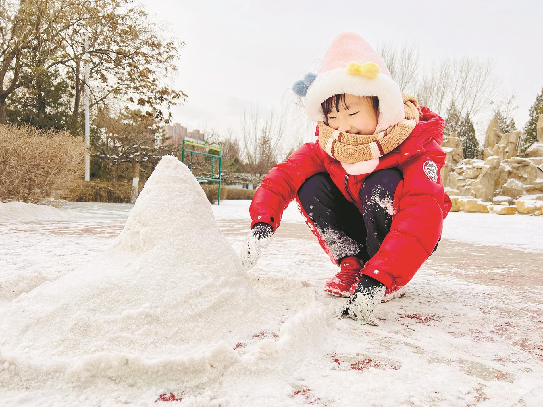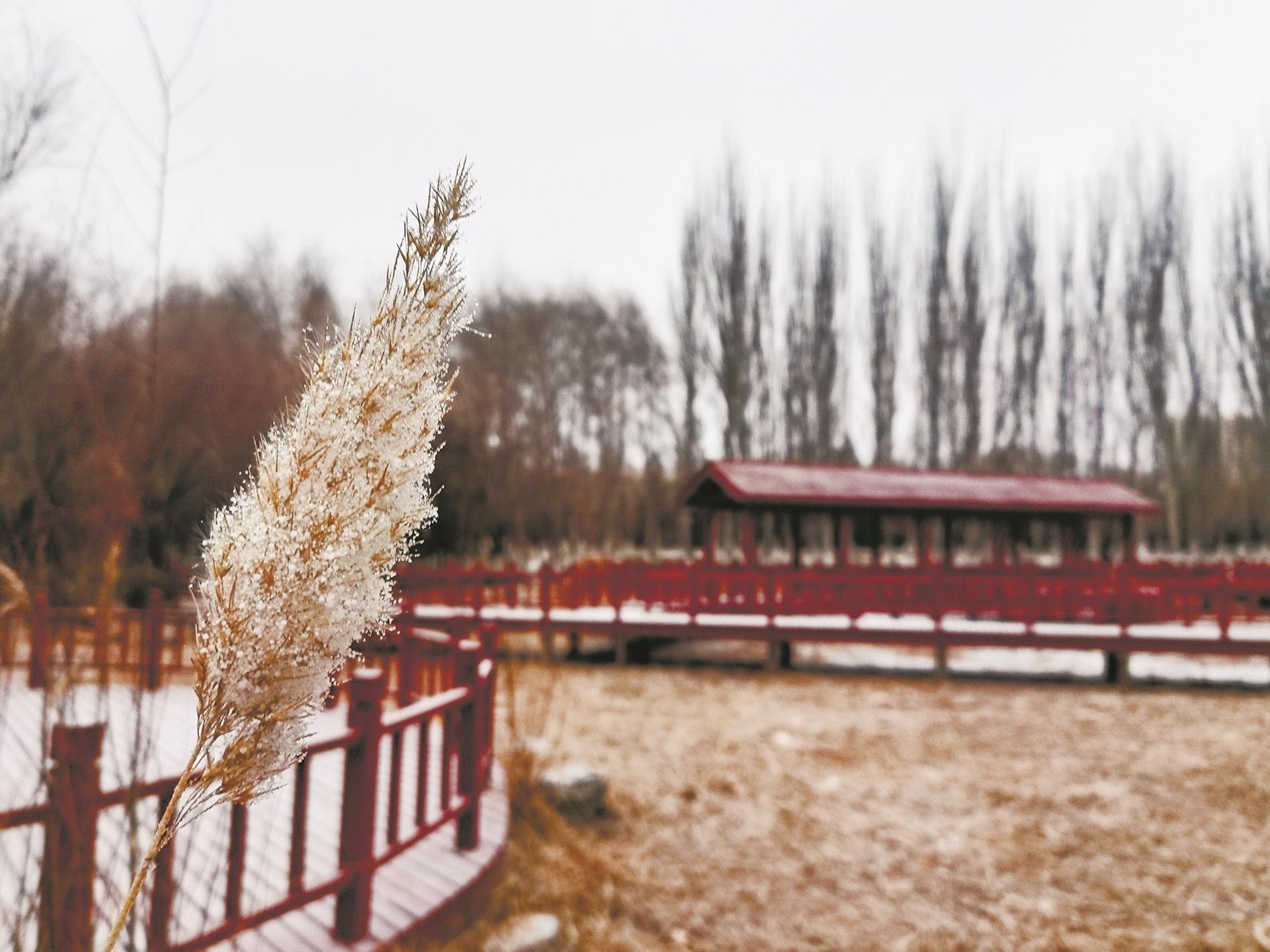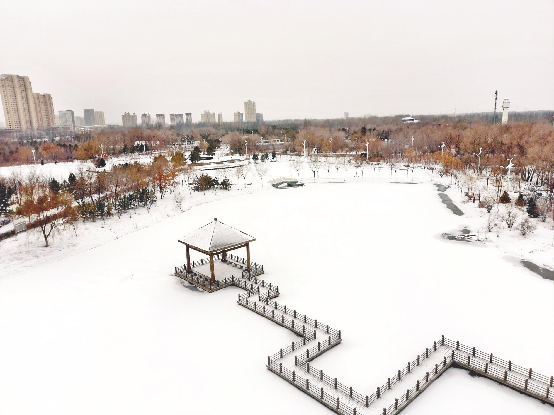 银装素裹下的市植物园,湖中亭与湖面相映成趣,柔和静谧、仙气十足。(王超 摄)