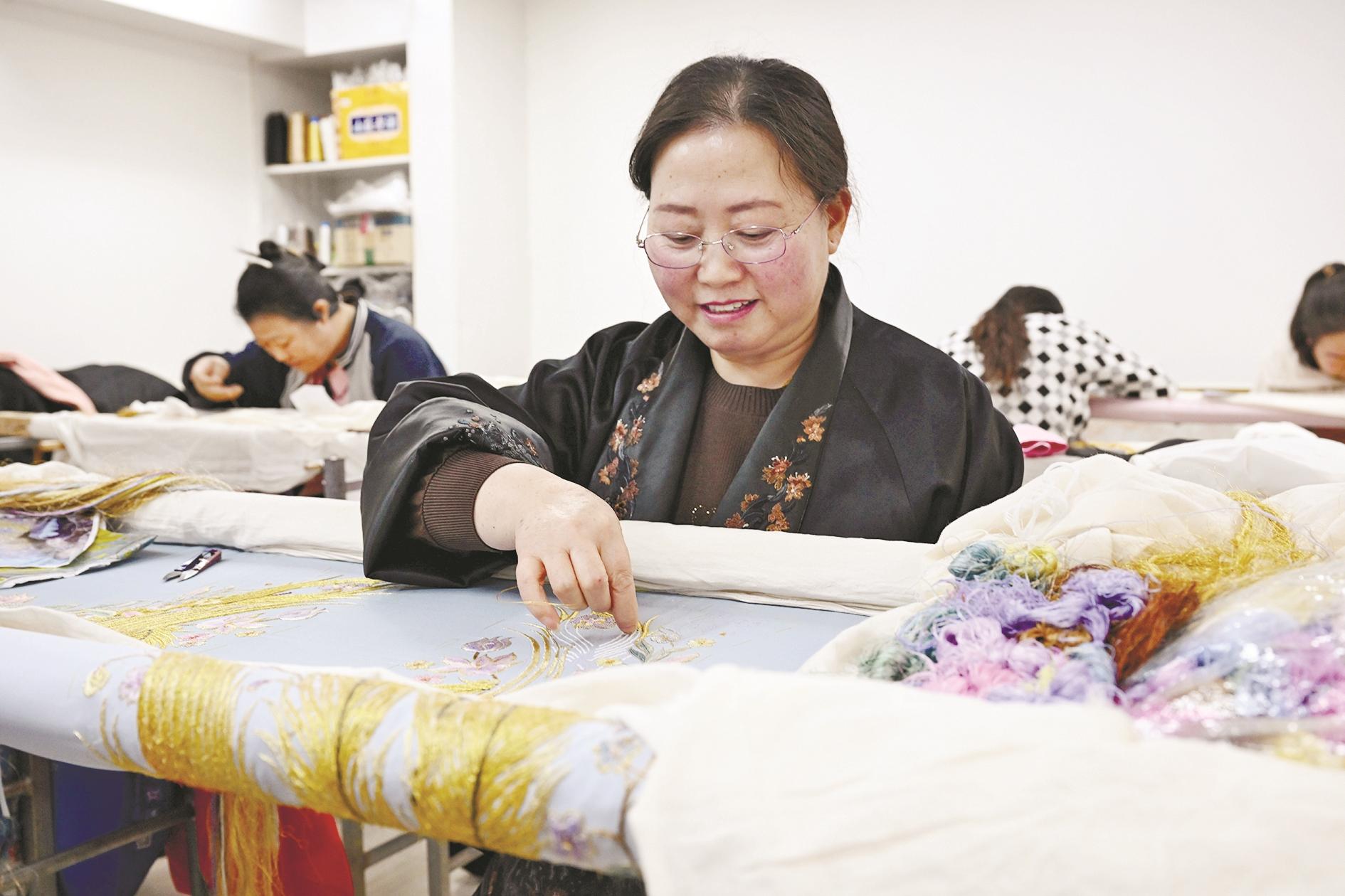 12月13日,王国荣在工作室内刺绣。河北省非物质文化遗产项目“王氏宫绣”代表性传承人王国荣潜心研究刺绣30余年。近年来,王国荣在家乡河北省隆化县创立工作室,为高端定制服饰进行代加工,非遗技艺得到传承的同时,还带动当地40多名绣娘发展“指尖经济”,工坊年收益达120余万元。 新华社记者 金良快 摄