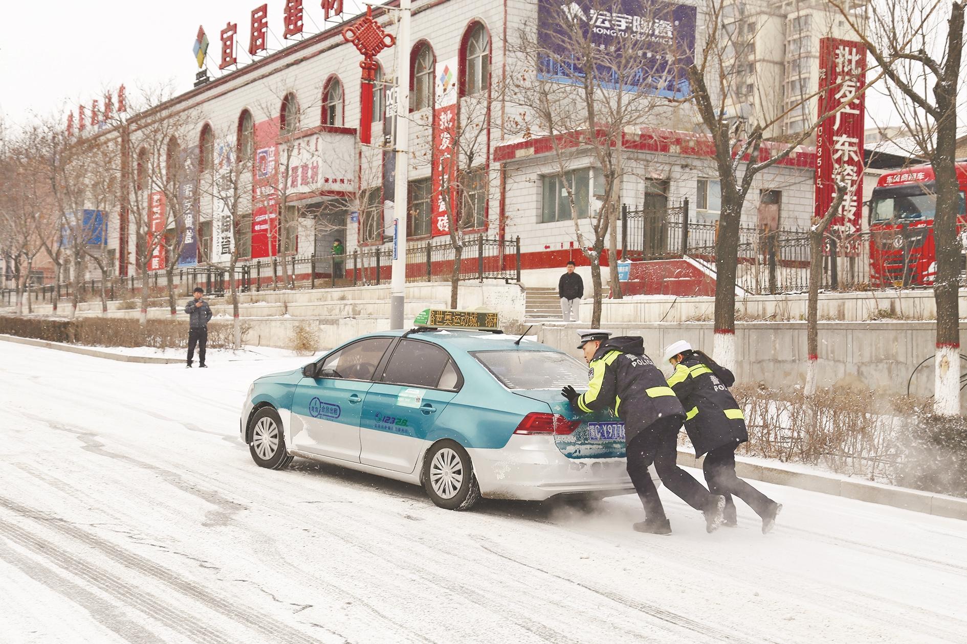 近日,我市迎来一场大雪,乌达区为方便居民安全出行,环卫工人、社区志愿者紧急上岗清扫道路,确保最短时间清理干净积雪。乌达交管大队全员在岗维护好交通秩序,帮助市民平安出行。图为交警帮助出租车雪中爬坡。 (金树泉 摄)