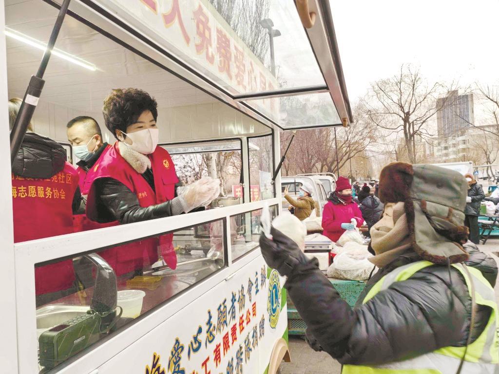 热乎乎的米粥、包子,每天早晨环卫工人可免费排队领取。近日,在乌达区健康主题广场附近,爱心志愿者们正在为环卫工人免费发放爱心早餐。