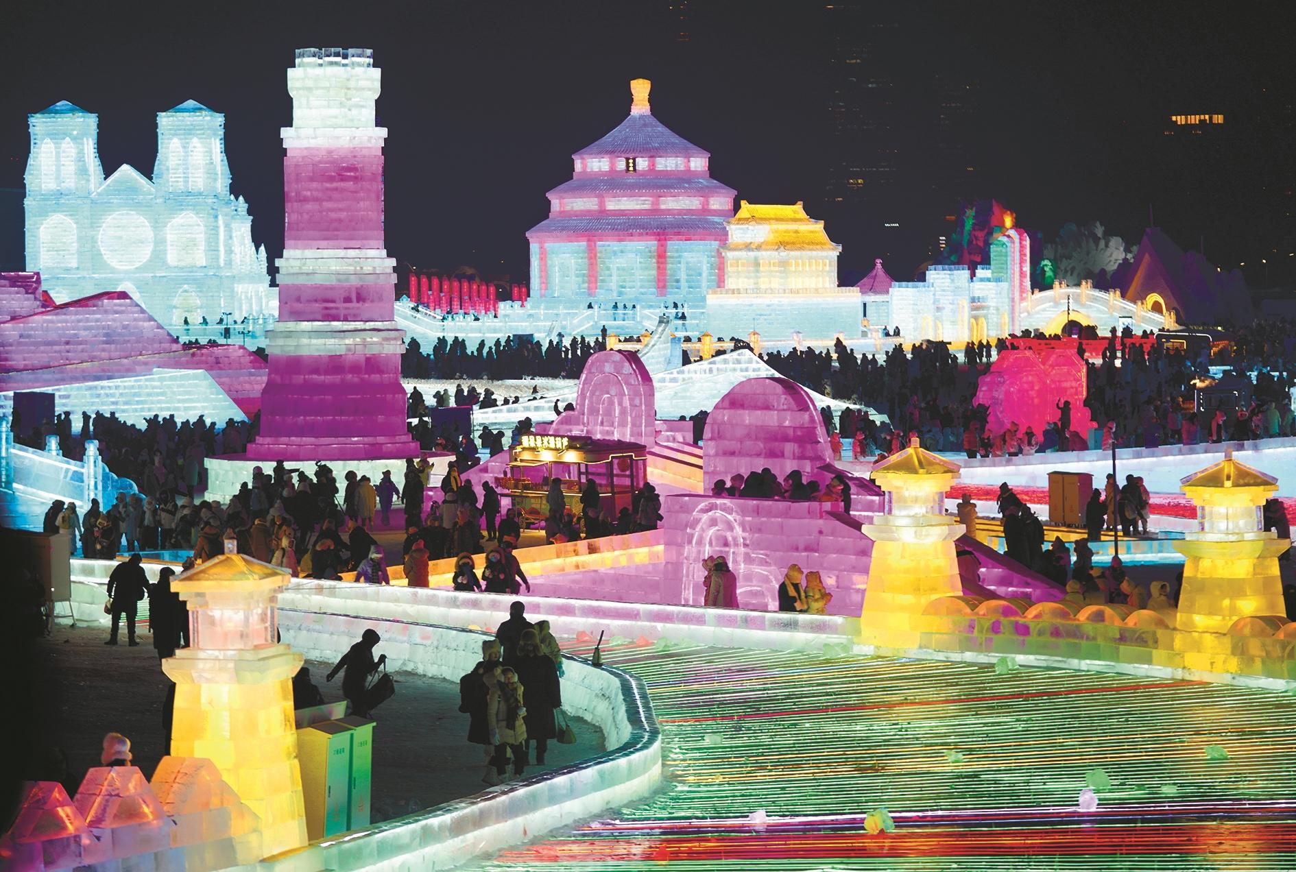 12月18日,游客在哈尔滨冰雪大世界园区内游玩。当日,第二十五届哈尔滨冰雪大世界正式开园,园区内全部娱乐设施已就位,欢迎世界各地游客共同开启一场“冰雪盛宴”。本届冰雪大世界园区总体规划面积81万平方米,为历届规模最大,共使用25万立方米的冰和雪打造千余个冰雪景观。 新华社记者 王建威 摄