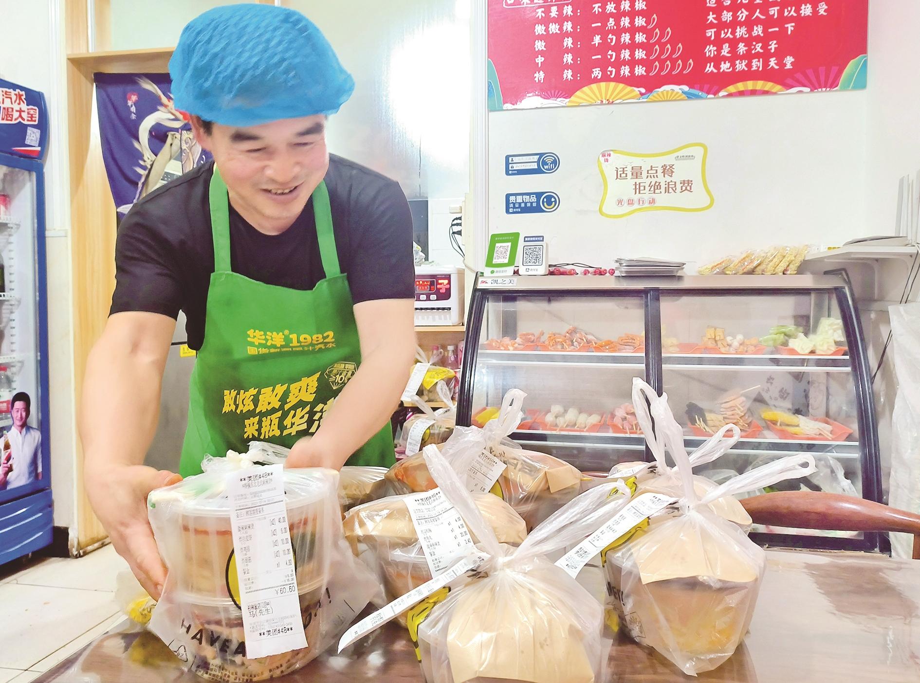 进入冬季以来,连续几轮的冷空气“吹热”了线上餐饮消费市场。麻辣烫、羊肉粉汤、粥品、炖品等美食的外卖订单量明显增长,餐饮企业纷纷加大线上促销力度,让生意更红火。图为近日,海勃湾区一家麻辣烫餐馆经营者备好外卖订餐。 (路静 摄)