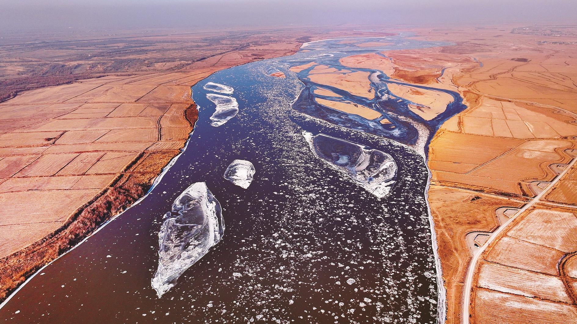 近日,受持续低温寒潮天气影响,黄河宁夏段出现流凌景观。朵朵冰凌,如同盛开在河面上的“冰花”,与黄河两岸的冬日景色构成一幅独特的黄河冬景图。
