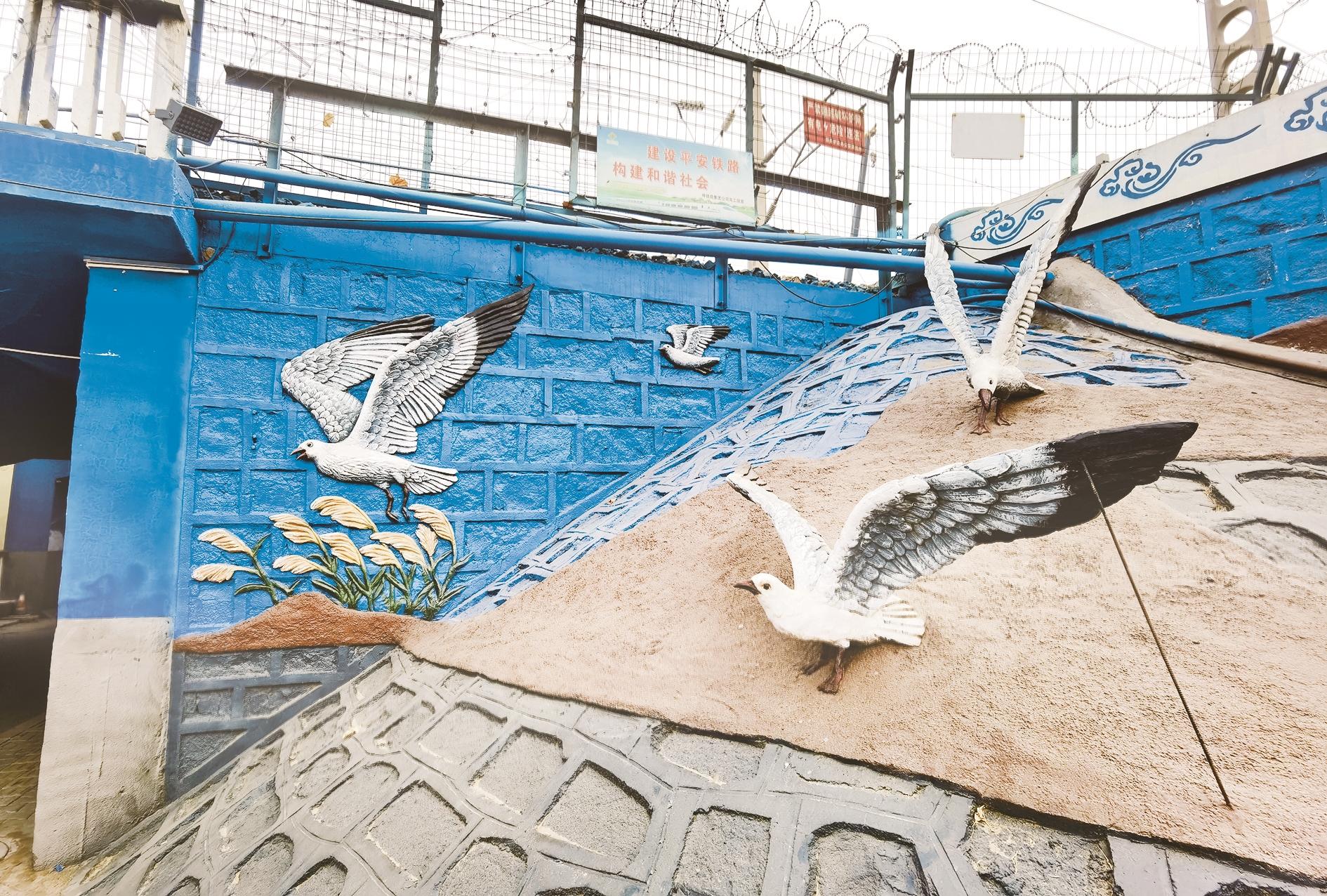 市公用事业发展中心工程科工作人员告诉记者,学府东桥是包兰铁路与海达街交会的公铁立交桥,桥梁建成年限长,护坡毛石自然风化、起砂,覆盖彩色涂料后有隔绝空气、延长使用寿命、保护建筑物的作用。施工时,在保持毛石墙原始肌理的同时,局部辅以泥塑造型,增加图案的立体感。“红嘴鸥”泥塑施工时要求塑形和着色要1∶1真实还原,并与沙漠、天空背景形成较好的视觉冲击。“学府桥位置特殊,项目立意、选材、工艺等经过多方讨论最终定稿施工,是我市桥洞文化的核心项目和标杆。”该工作人员说。