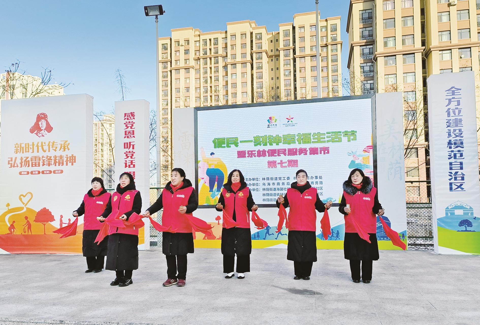 12月23日,海勃湾区林荫街道办事处海馨社区举办了第7期“百城千圈联动 便利美好生活——便民一刻钟幸福生活节”暨乐林便民服务集市活动。图为海馨社区银发宣讲团成员在活动中表演节目。 (张靖爽 摄)