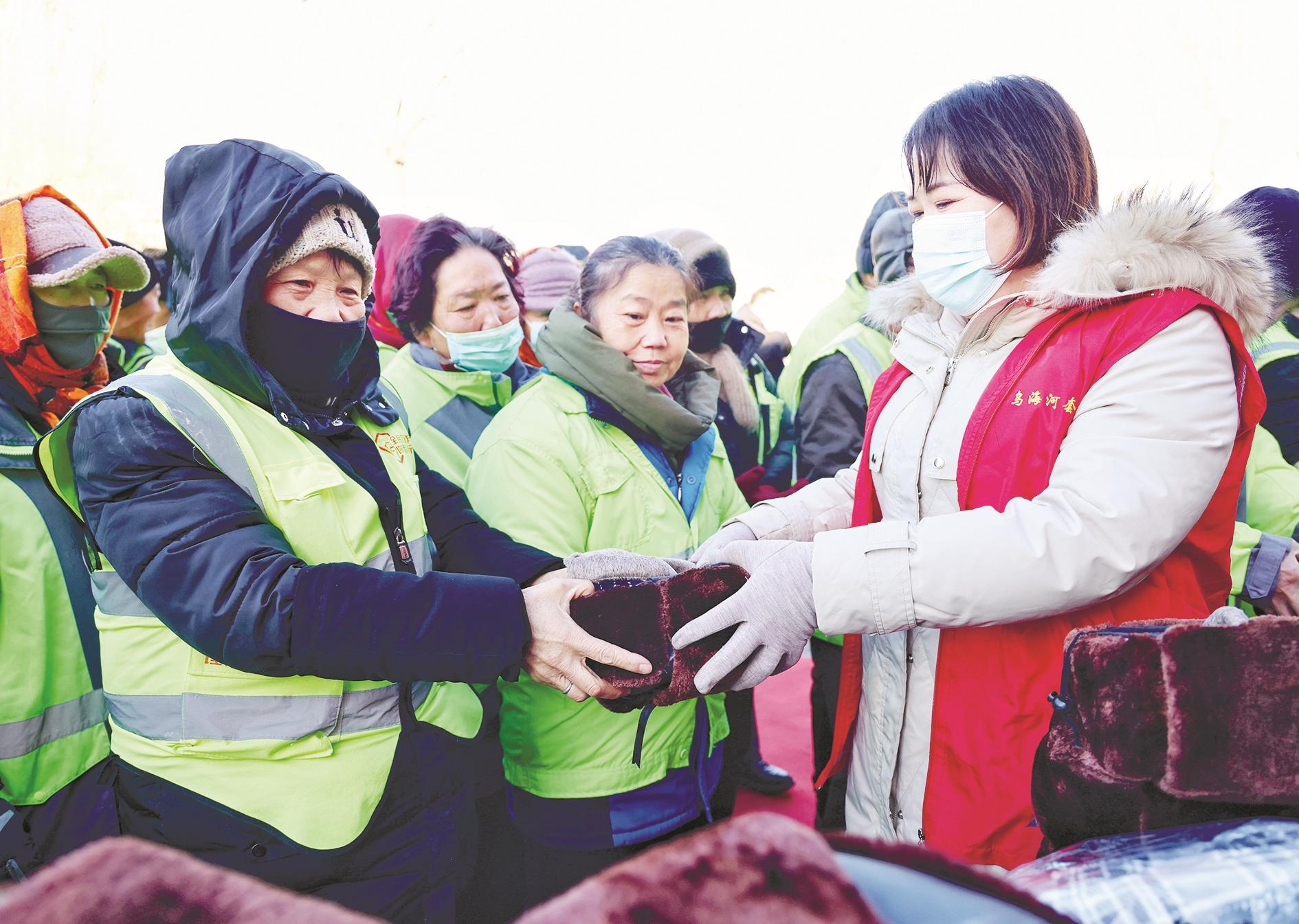 12月24日,市委统战部、市工商联联合市河套商会开展冬日送温暖活动。爱心企业向环卫工人捐赠围巾、手套、帽子等物品,并送上烩酸菜等饭菜,让环卫工人感受到浓浓的暖意。 (高瑞鹏 摄)