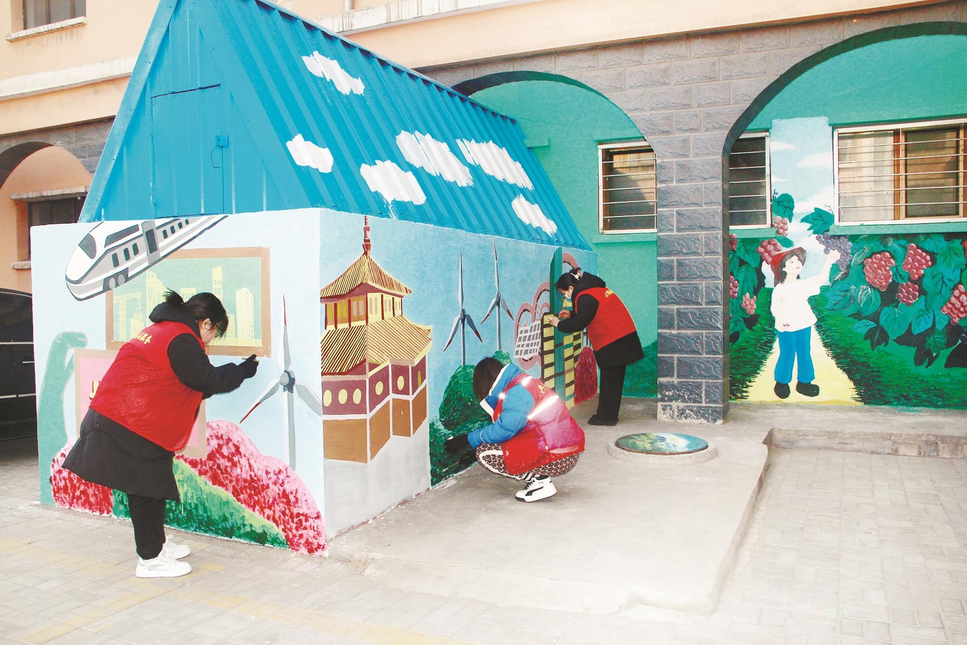 为进一步美化小区环境,让辖区更多居民畅享“新”生活,不断刷新小区“颜值”,近日,海南区拉僧仲街道华苑社区组织辖区党员、网格员在青庭家园小区开展“青春志愿 靓在驿站”墙绘志愿服务活动。 (段维娜 摄)