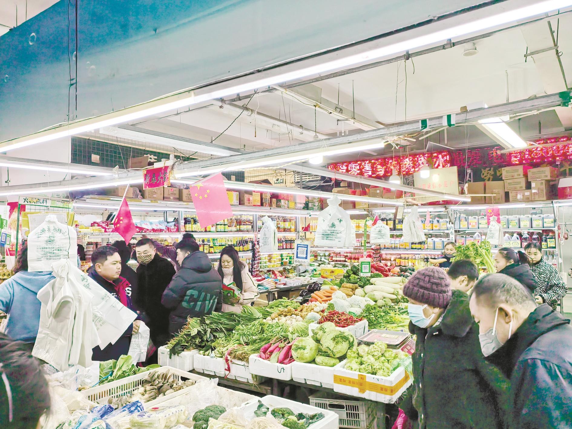 在维邦市场,品种丰富、数量充足的各类商品摆满货架,呈现出购销两旺的红火景象。在一家拥有20多种酱菜的店铺里,前来挑选酱菜的顾客络绎不绝;新鲜水果摆成了山,吸引着来来往往选购的市民;面食摊位前,许多顾客成包地购买饼、馒头。