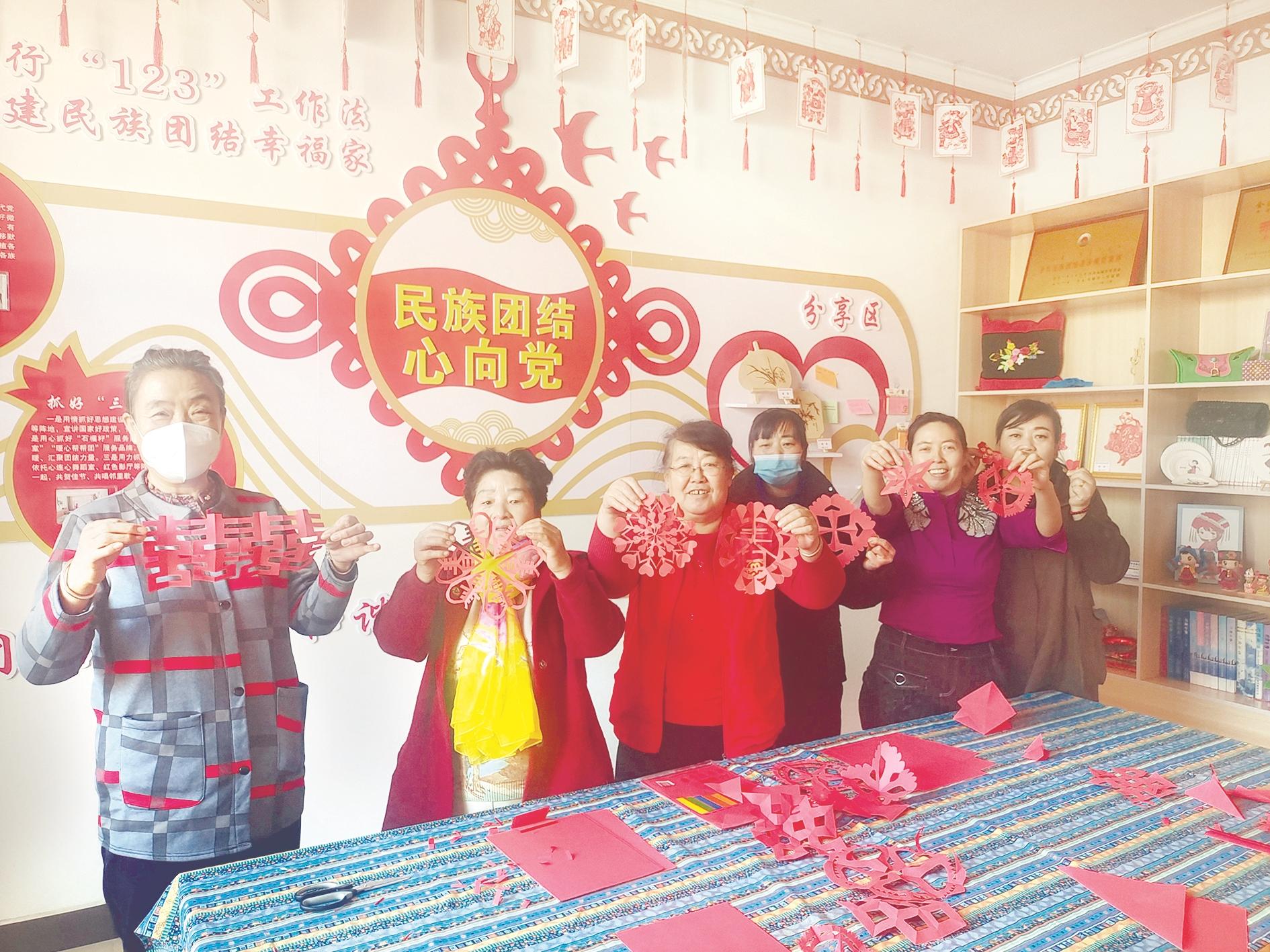 新桥社区举办“喜迎新春庆元旦,共叙民族团结情”联欢会,邀请辖区文艺团体代表、各族居民代表、老党员、社区工作人员等60余人欢聚一堂,载歌载舞,共同辞旧岁,喜迎新年的到来。“你比划,我来猜”、有奖竞答、乒乓球、投壶、踩气球、绕口令等游戏丰富多彩,居民们积极参与,热情投入。居民李玲玲说:“今天的活动特别热闹,节目一个比一个精彩,我拍了很多小视频发到朋友圈,和家人、朋友们共同见证这辞旧迎新的美好时刻。”与联欢会同时进行的还有“民族团结一家亲”剪纸活动,居民们围坐在一起,拿着剪刀,挑选了自己喜欢的“图案”,认真耐心地开始剪纸,一个个红红的“喜”字、花朵、“福”字在手中成形。