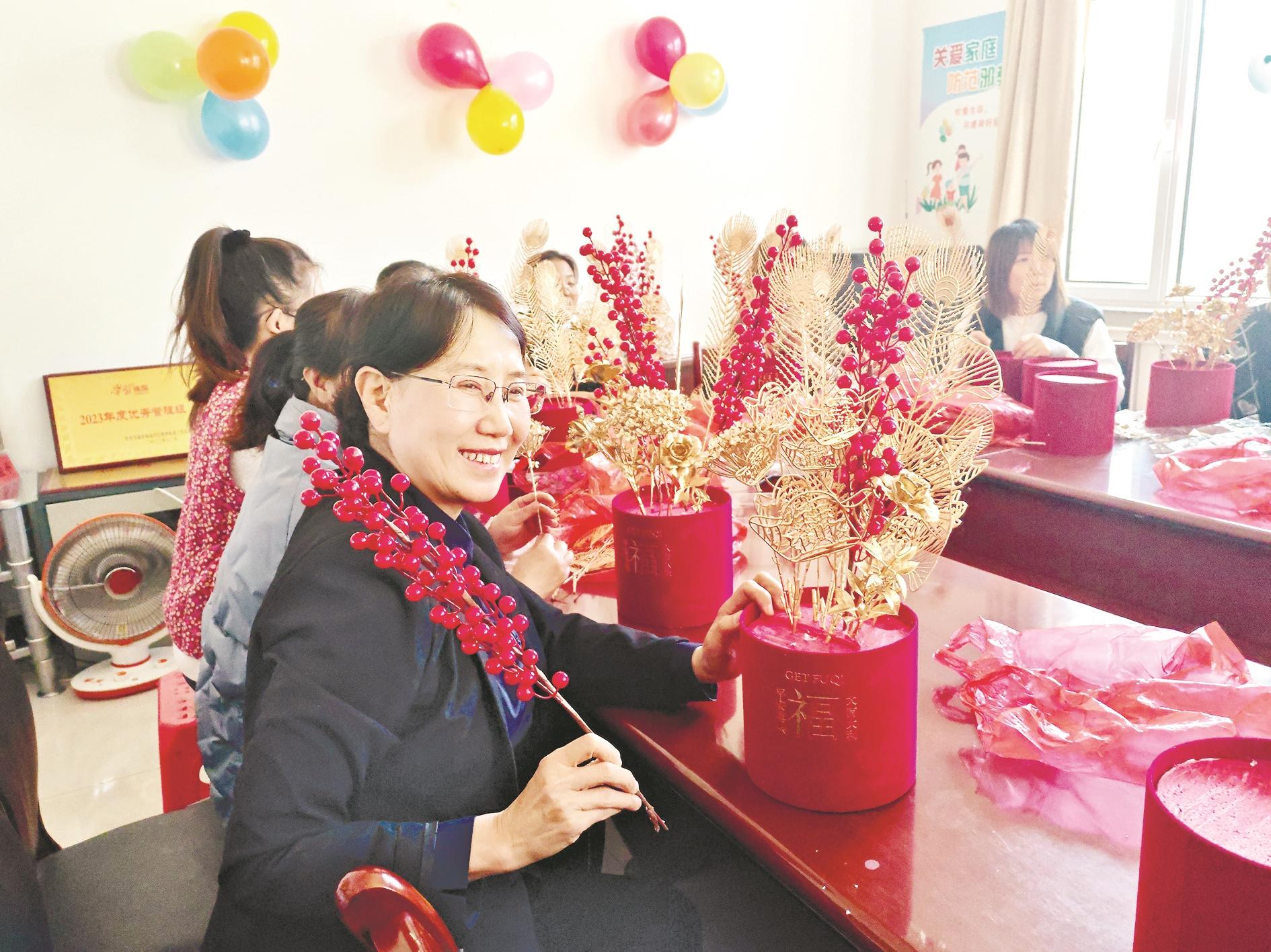 新世纪社区开展“情暖社区迎元旦、民族团结一家亲”手工制作福气抱抱桶活动。社区工作人员为大家发放福气抱抱桶制作材料,并详细介绍制作福桶的步骤及插花技巧。在工作人员的引导下,大家依次将银杏叶、冬青果、尤加利叶插入到花桶中,并根据自己的喜好点缀上中国结、小灯笼等装饰品,不一会儿,一盆盆金灿灿、红彤彤的福桶制作完成。