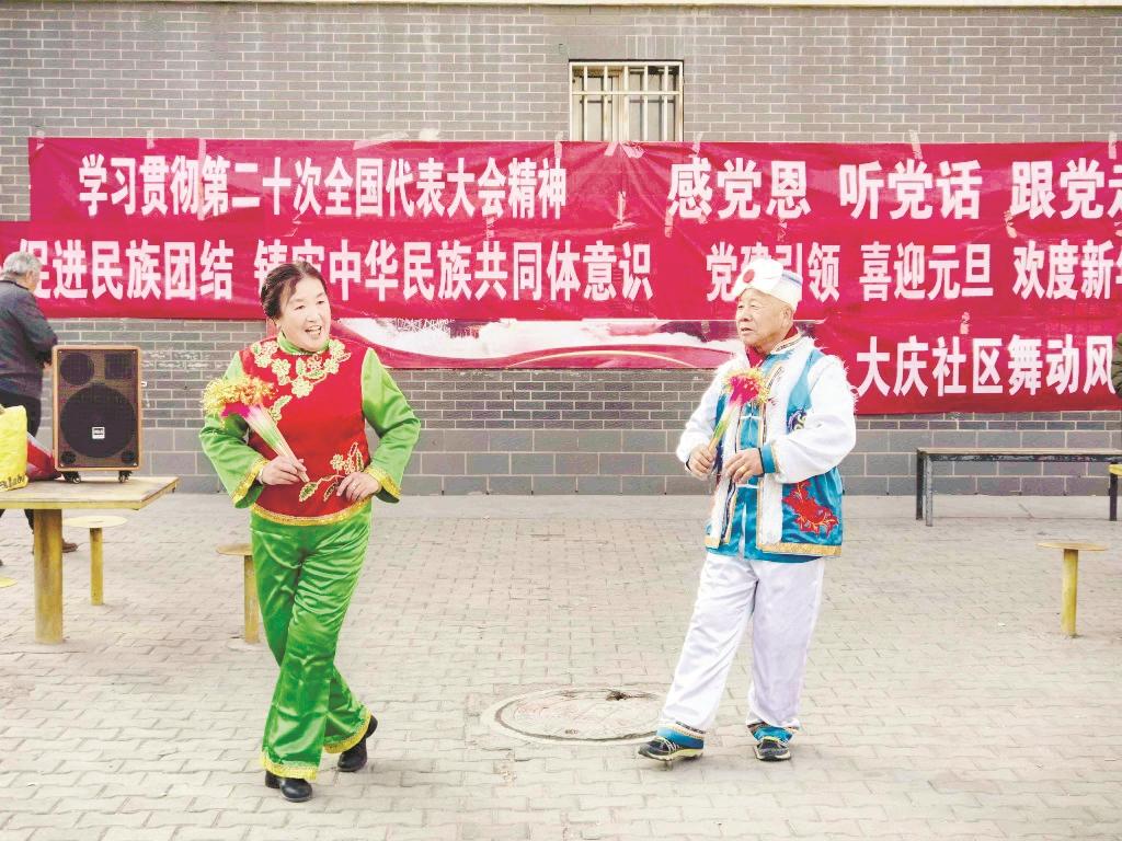 2023年12月28日,海勃湾区林荫街道举办辞旧迎新惠民演出活动,为辖区居民送去欢乐和新年祝福。图为曲艺爱好者表演二人台《打金钱》。 (张靖爽 摄)