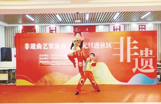 2023年12月28日,市文化广电事业发展中心组织我市部分优秀非遗项目走进自治区非遗特色村镇海勃湾区千里山镇新和社区,开展“非遗曲艺贺新春 欢庆元旦进社区”活动,为社区居民送上一场丰富多彩的曲艺文化盛宴。 (靳婧 摄)